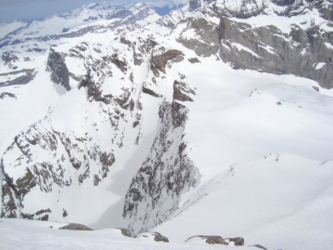 Einfahrt noch etwas hart aber nach unten hin im Sonnensektor dann zunehmend sulziger werdend. Es war eine wahre Freude hinunterzuwedeln. Den Oberschenkeln zuliebe mit einigem Unterbruch;-). Solche Verhältnisse hätte ich im Aufstieg heute nicht erwartet!