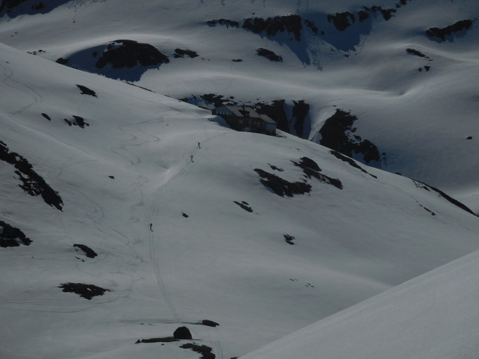 Die Abfahrt oben kurz Hart, dann schon viel Sulzschnee bis zur Oberalpstrasse.