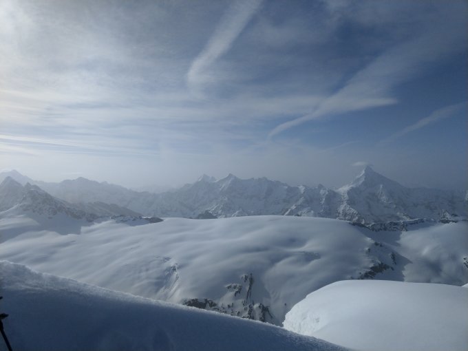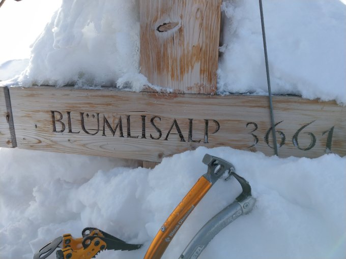Wand sehr gut eingeschneit, es treten noch keine eisige Stellen hervor. Bedeckte Nacht und warmer Tag mit Nullgrad-Grenze oberhalb 3000m. Schnee nur oberflächlich gefroren. Aufstieg daher oft eine Wühlerei. 5.45 am Wandfuss. 8.00 auf Gipfel. Abstieg über Normalroute problemlos, da Platten mit bestem Trittfirn eingeschneit. 9.00 wieder auf Gletscher. Zustieg und Abstieg mit Schneeschuhen.