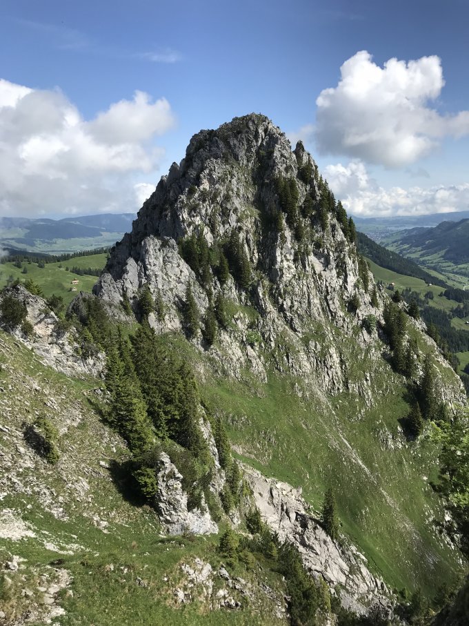 Den ersten Versuch machte ich auf der direktesten Route vom Geissloch auf der Ostseite des Haggenspitzes über die steile Geröllhalde. Ich musste ihn jedoch auf 1'415 m abbrechen, weil Wanderer weiter oben Steinschlag auslösten und ich keinen Helm auf hatte, weil ich wegen der Anreise mit dem Bike keine Wanderstöcke hatte und weil die Sonne am späten Vormittag schon viel zu heiss brannte. Am selben Tag versuchte ich den Aufstieg von der Haggenegg her. Der Weg durch den Wald war sehr angenehm und auch als er sehr steil wurde, war er gut begehbar. Auf der Höhe von 1'566 m war jedoch ein Felsband, das ich nur gesichert überquert hätte. Ich hatte zwar Sitzgurt und Seil mit, aber das nütze mir nichts, weil die Bohrhaken so weit oben waren, das ich sie nicht erreicht hätte. Weil ich ja nicht riskieren wollte und nur den Weg auskundschaften, drehte ich wieder um.