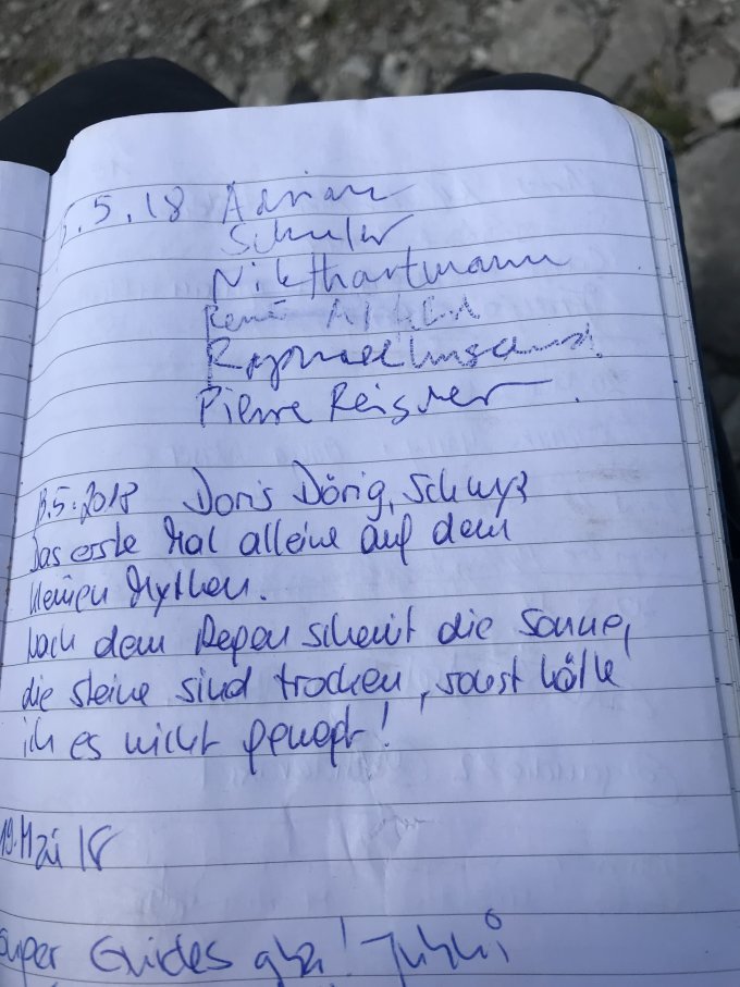 Im Gipfelbuch des Kleinen Mythen suchte ich den Eintrag von Nik Hartman und seiner Entourage vom 15. Mai und musste feststellen, dass mein Eintrag vom 19. Mai grad unter seinem Eintrag stand. Damals hatte ich das gar nicht bemerkt.