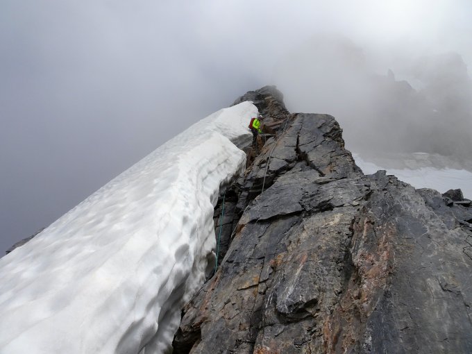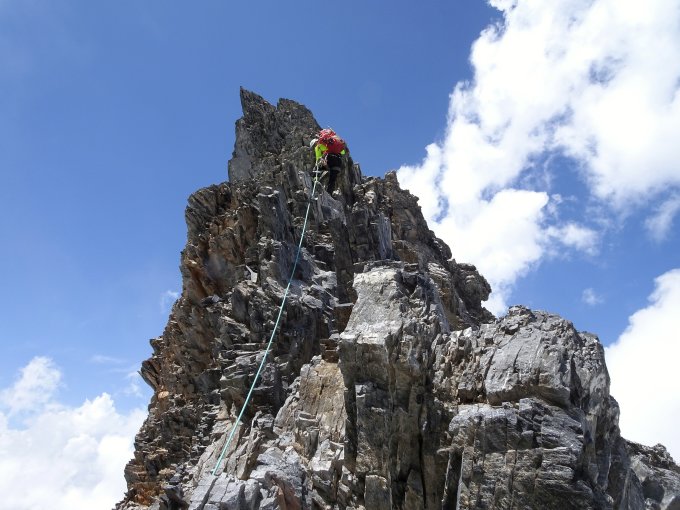 An den Schlüsselstellen finden sich Fixseile und im oberen Teil des Nordwestgrats Sicherungsstangen, was v. a. im Abstieg hilfreich war. Der Rest kann, soweit erforderlich, gut selbst abgesichert werden. Trotz viel Schuttauflage im Gehgelände sind die steileren Passagen fest, griffig und schön zu klettern. Die Zacken des Leiterngrats können teils ausgesetzt, aber nicht sehr schwierig überklettert werden (II), die ostseitige Umgehung in steilem bröseligen Gelände sah wenig einladend aus.