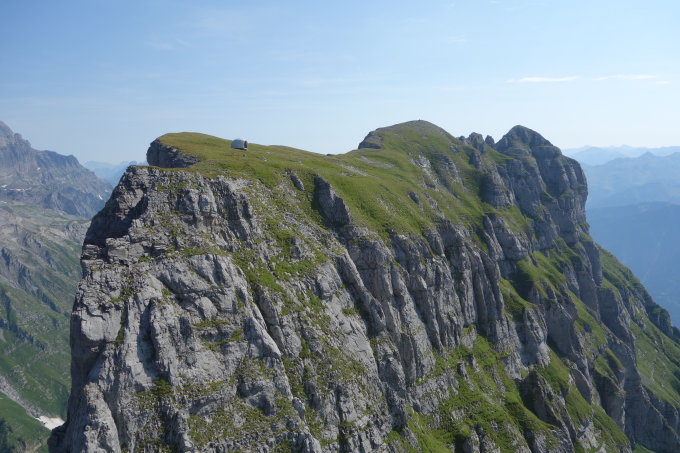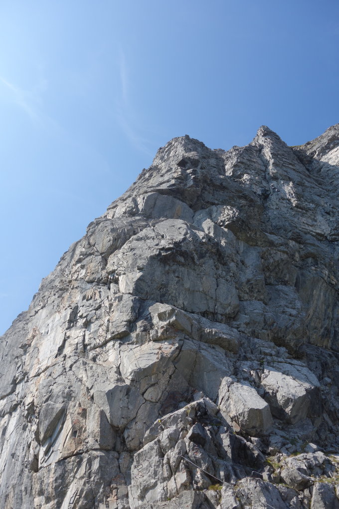 Im Kamin liegt zu Anfangs viel Geröll, was aber schnell besser wird. Im Kamin selber doch passable Felsqualität und man kann ein paar schöne Züge klettern. Um Steinschlag zu vermeiden und der Mangel an festem Gestein haben wir auf die Seilsicherung verzichtet und sind im sehr kurzen Abstand geklettert. Wenn es andere Seilschaften im Kamin hat ist dieser auf jeden Fall zu meiden!. Es finden sich unterwegs 2-3 antike Schlaghaken. Nach dem Kamin liegt ein queres Schuttband was einen links auf eine Art Weg führt. Das Wiesengelände mit Blockdurchsetzung kann dann einfach mit permanenten "Allrad" bis zum Gipfel überwunden werden.Aber auch hier wieder Vorsicht, es ist nicht alles fest was man greift!