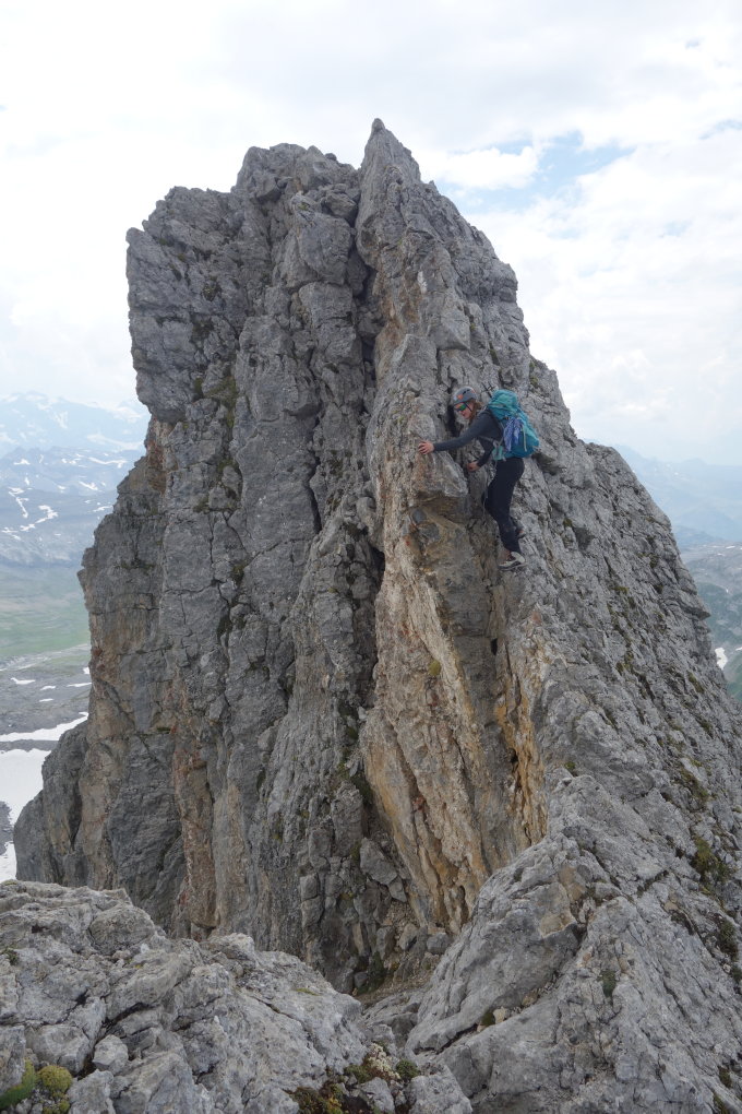 Runterwärts dem Grat und den Kratzspuren folgen zur Schuttbandroute. Eine Stelle ca. Abklettern II, exponiert, der Rest vom Grat eher ein ausgesetzter Wanderweg, aber schön.