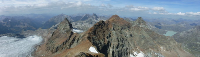 Tourenbeginn um 07:00 Uhr bei 7°C und klarer Sicht unter wolkenlosem Himmel bei Sonnenaufgang. Sehr abwechslungsreiche und aussichtsreiche Kombinationstour. Schöne Fernsicht heute. Sogar bis zum Bianco-Grat.