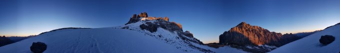 Der Weg zur Schlossberg Lücke gut markiert mit viel losen Schotter, der Gletscher mit wenig gutem Trittschnee bedeckt und der Fels trocken. Leider hat uns der Föhnsturm einen Strich durch die Rechnung gemacht- wir sind nach der ersten Seillänge umgedreht.