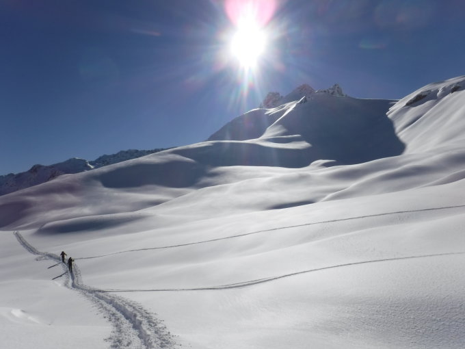 Bin spät gestartet, in der Hoffnung, dass jemand schon gespurt hat. Bei dem tiefen Pulver wäre es sonst kraftraubende Wühlerei geworden. Hoffnung erfüllte sich. 9 Skitourengänger waren vor mir unterwegs. Vielen Dank ! Im Abstieg begegneten mir noch 5 Aufsteigende.