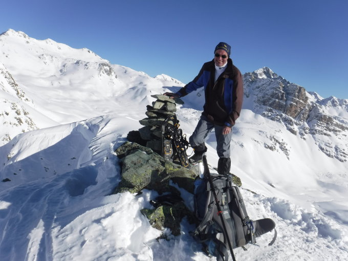 Tourenbeginn um 10:30 Uhr bei -14°C unter blauem Himmel. Auf dem Gipfel völlig windstill und in der Mittagssonne sehr angenehm. Neuer Pulverschnee liegt nun knietief. Auf anderen Routen war (noch) keiner unterwegs, zumindest nirgendwo im Umblick Skispuren entdeckt.