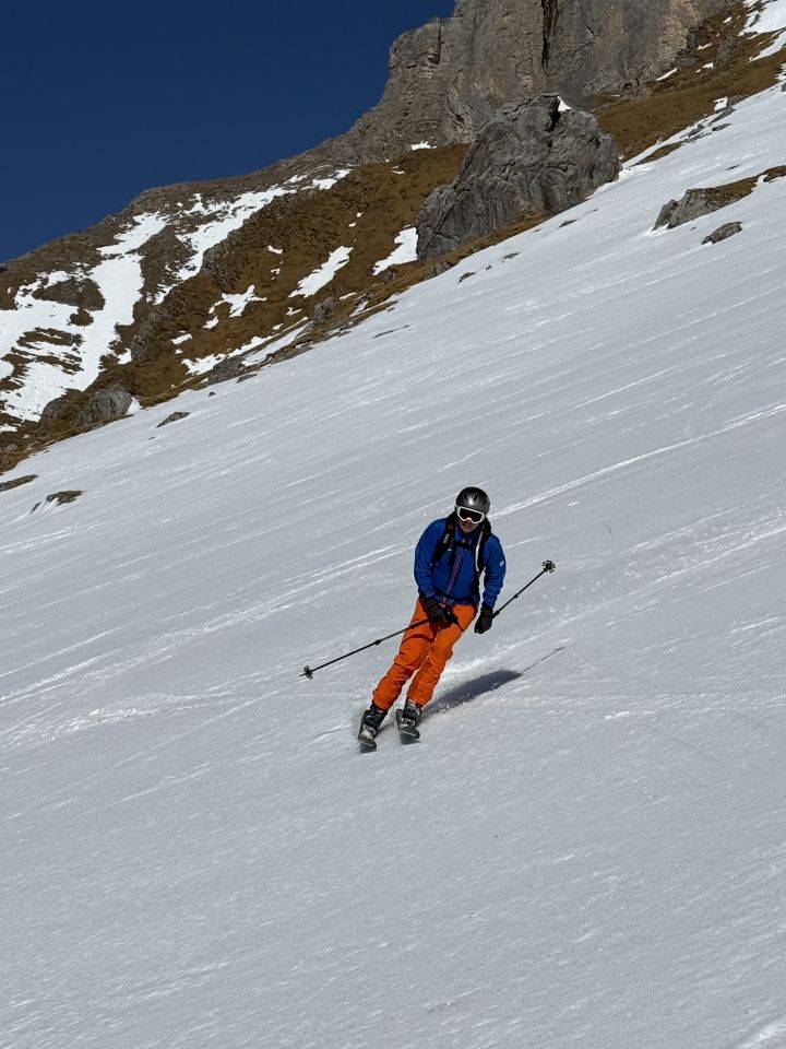 Start um 08.00 bei der Busstation St. Jakob, Isenthal. Zuerst 10 Minuten Skitragen, danach 3, 4 kurze apere Stellen bis 1474m. Ab dann sehr harter Schnee. Die grossen Nassschneelawinen sind noch nicht unten, der Schnee ist aber vom Material einer Staublawine übersät, lässt sich aber doch mehr oder weniger gut abfahren.