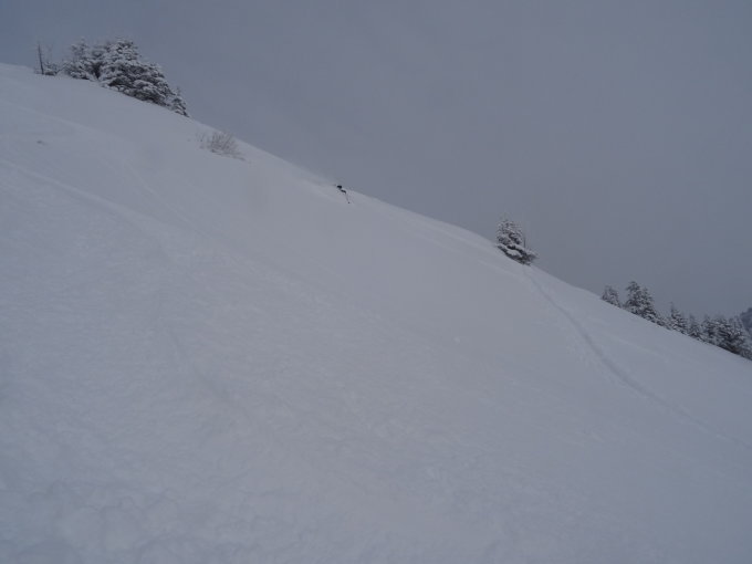 Hänge zur Starzelalpe lockerer Pulver, an Geländeübergängen kommt man auf die Eislamelle durch. Von den Ochsenhoferköpfen das gleiche. Litzenscharte zum Schwarwassertal lockerer Pulver.