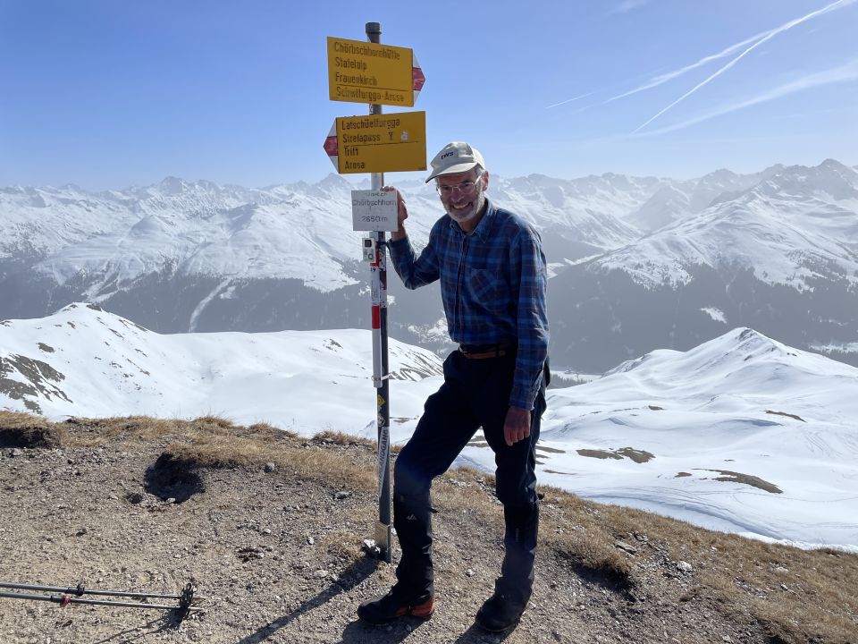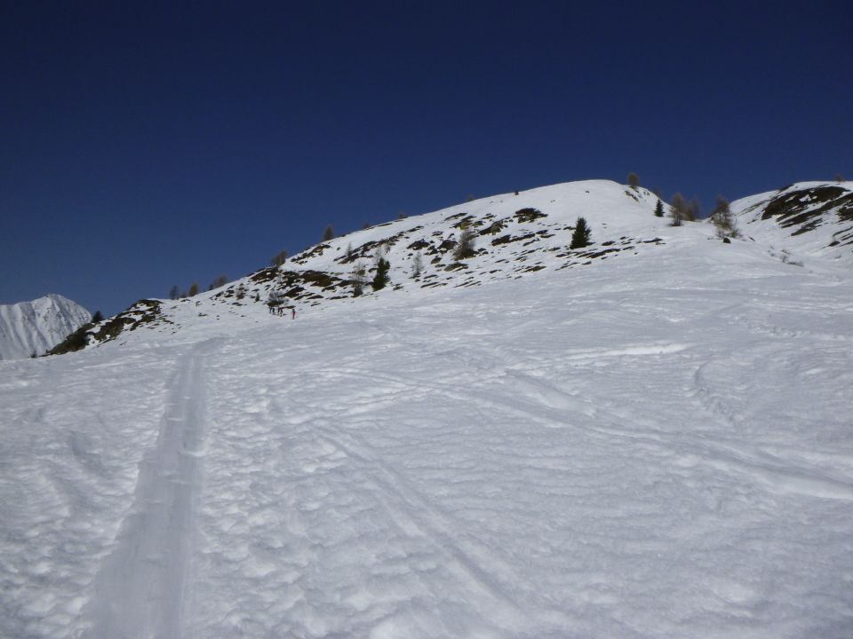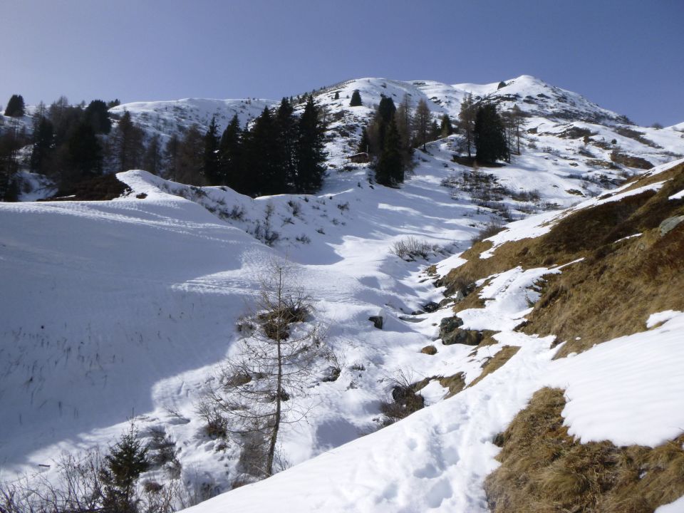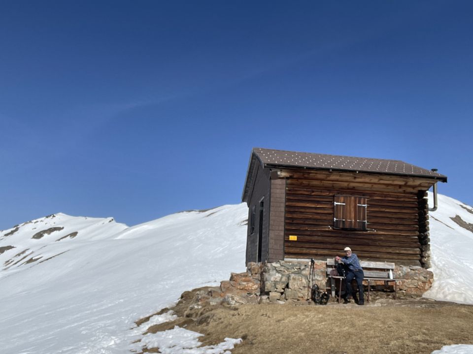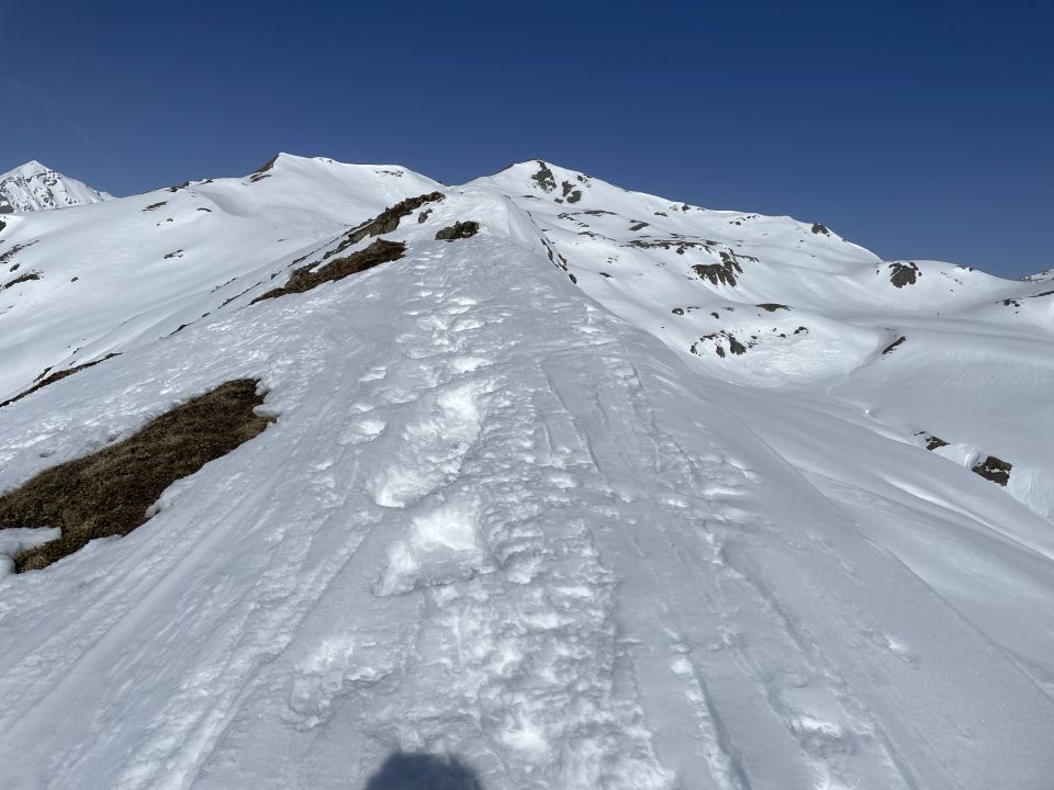 Tourenbeginn um 07:00 Uhr bei -2°C unter wolkenlosem Himmel. Tagsüber war die Sonne etwas milchig und trüb wegen dem Sahara-Staub. Um Gipfel war es windstill. Die schneefreien Stellen bei Matta kann man über den Winterwanderweg umgehen. Der Stafelweg ist bis zum P 1750 nur noch vereinzelt mit Schneeresten beschickt, so dass es inzwischen kürzer und schneller ist, über den Sommerweg bis zur Kehre am P 1750 ohne Laufgeräte an den Füßen aufzusteigen. Der Südrücken ist im Gipfelbereich abgeblasen. Der Erber Berg bietet dagegen noch viel und tiefere Schneeflächen an.