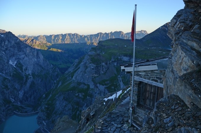 Wie ein Adlerhorst klebt die Kistenpasshütte am Felsen und bietet einen atemberaubenden Tiefblick auf den Limmernstausee und eine sagenhafte Aussicht auf Selbsanft, Bifertenstock, Tödi und bis zum Kaiserstock (und sogar die Spitze des Clariden).