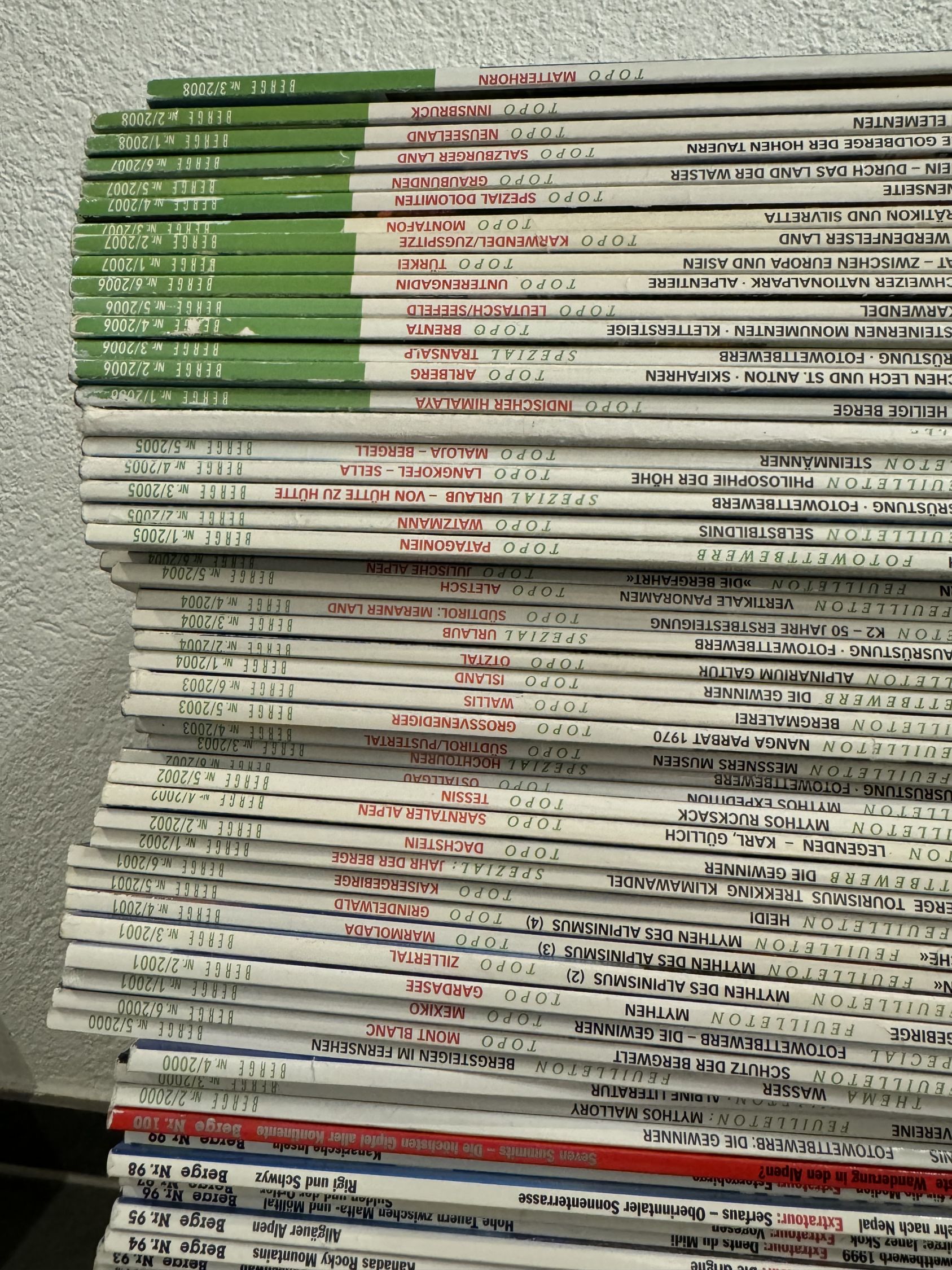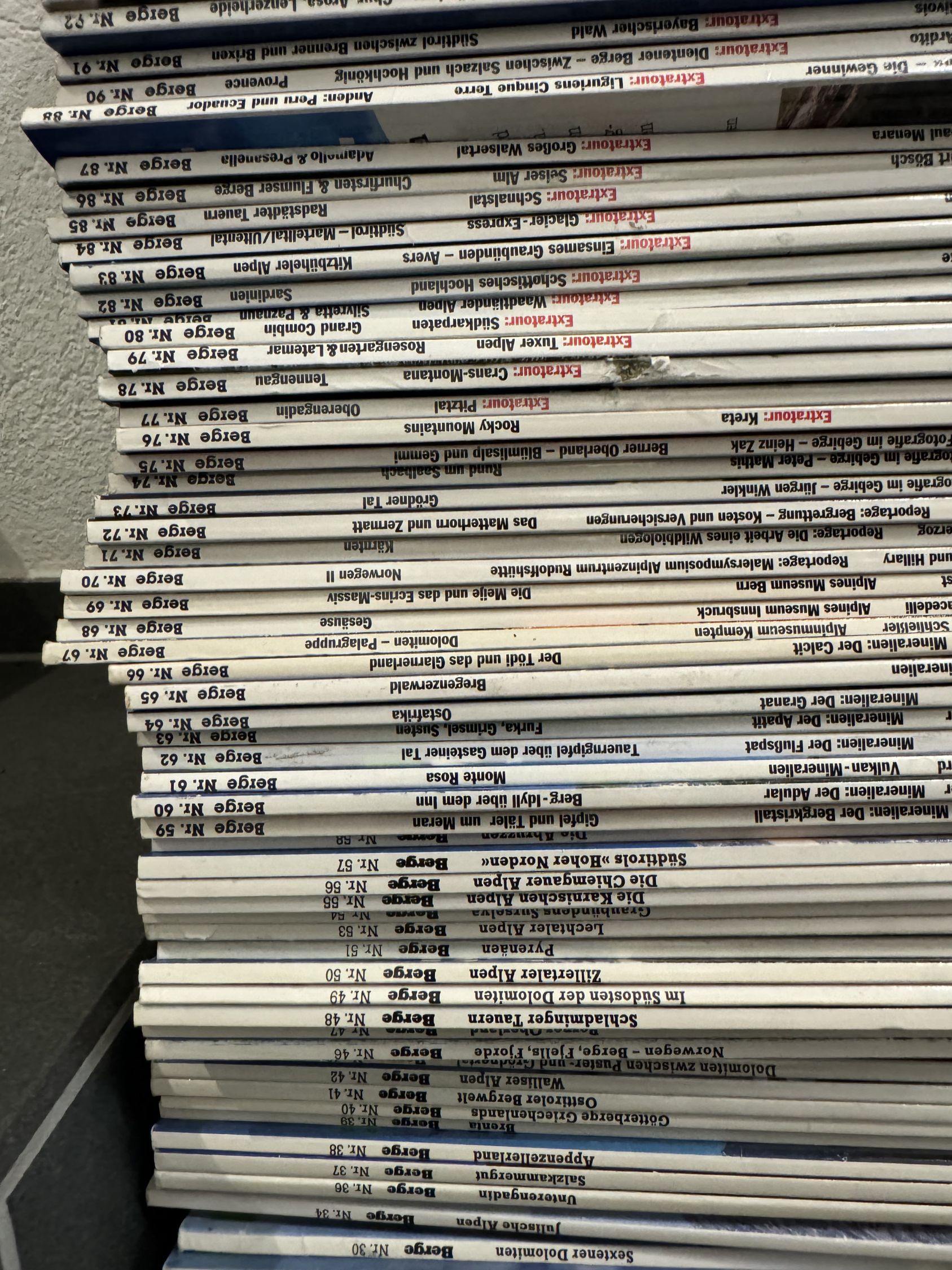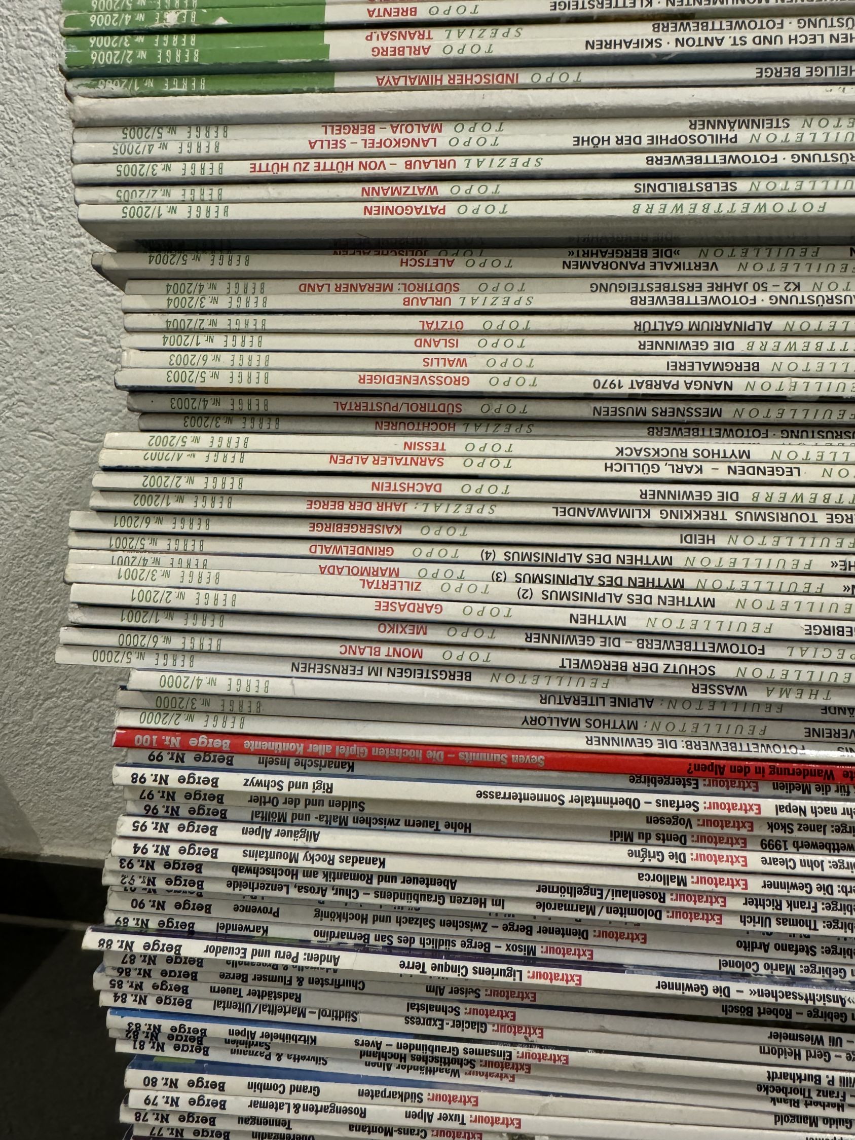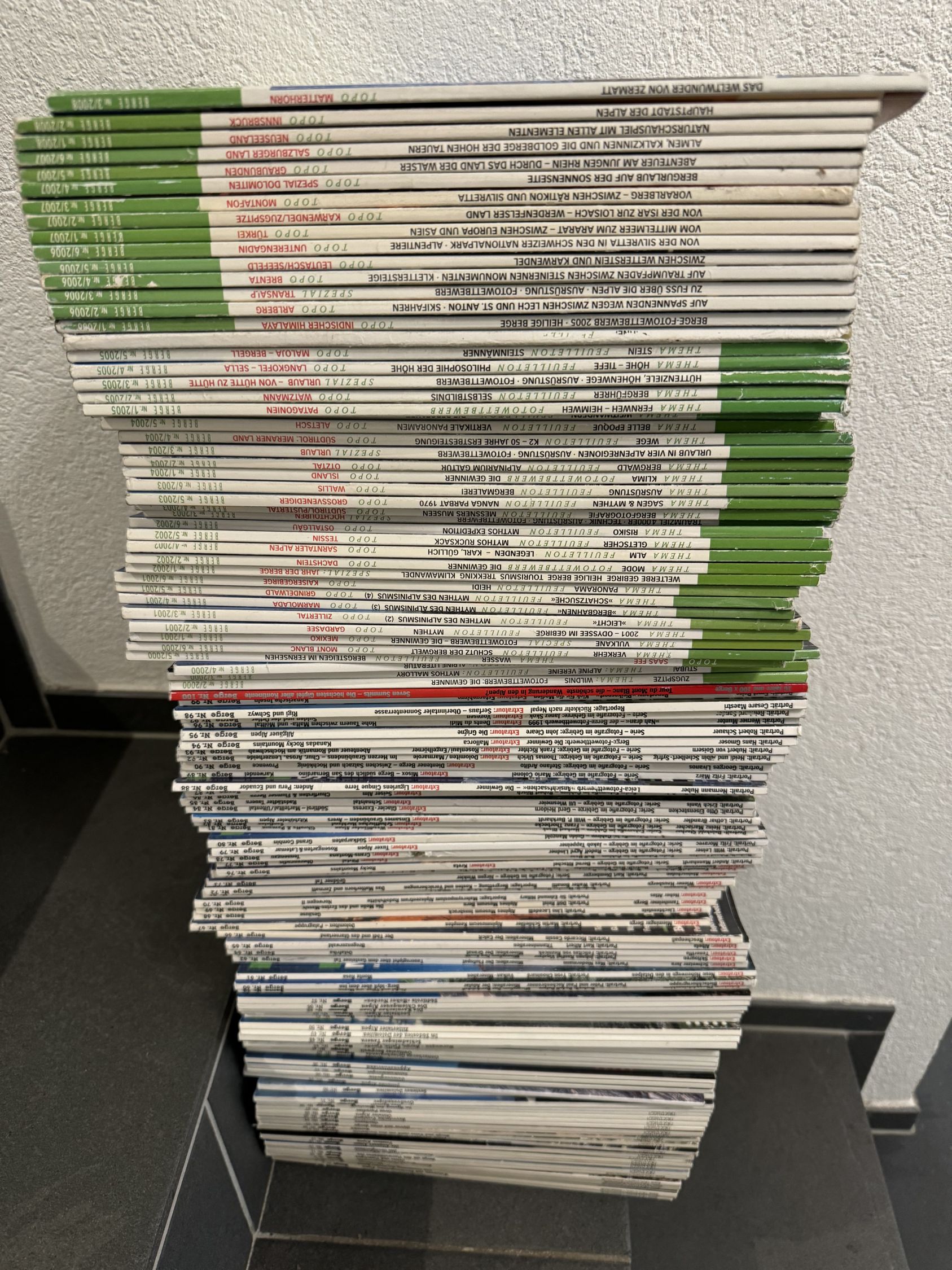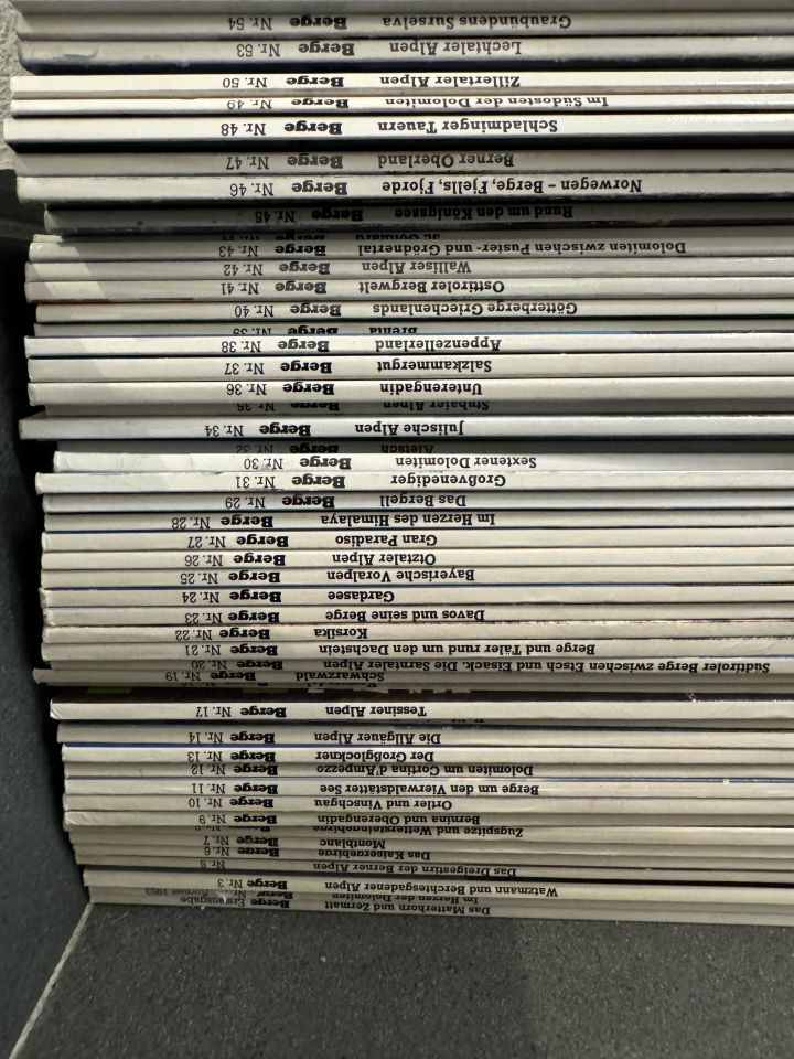 Ein vollständiges Konvolut der Zeitschrift „Berge“, Ausgaben 1 bis 150, Neuwert ca. 750 Franken. Die Ausgaben sind zum grossen Teil wie neu, einige weisen aber auch übliche Gebrauchsspuren auf.