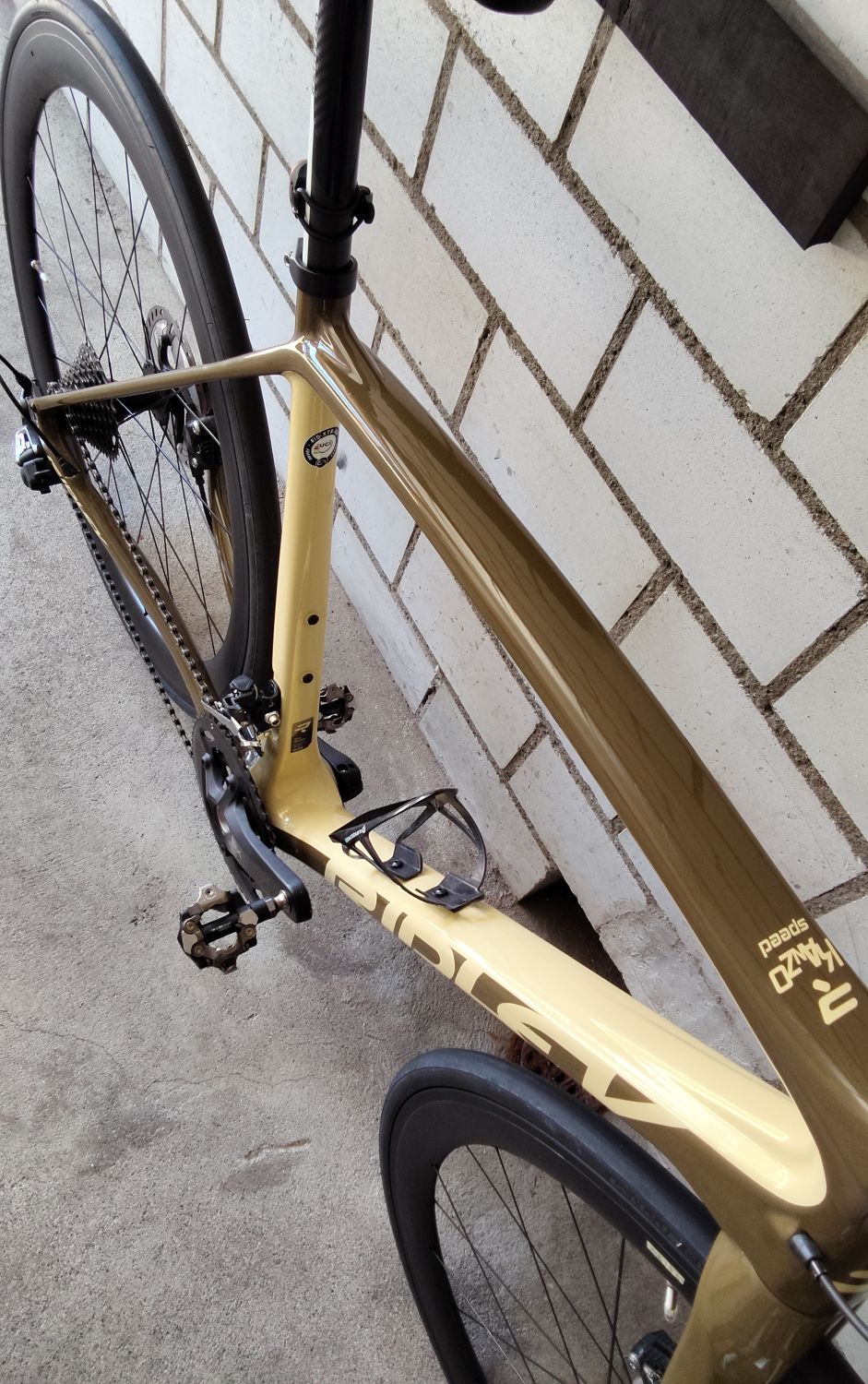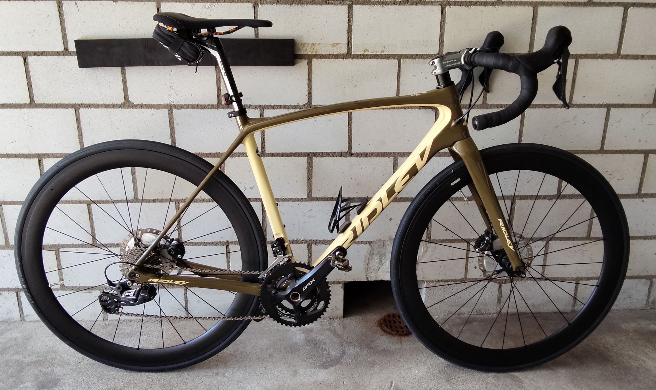 Rahmen: Grösse 54cm (FahrerIn: 173 bis ca. 180cm); Gewicht: 980gr; 30 Tonnen-High Modulus Carbon (Rahmen und Gabel), ultrabequem zu fahren (Rahmen/Gabel absorbieren Fibrationen), dennoch sehr schnell; UCI-Zertifiziert = offiziell für Rennen zugelassen. Farbe: camouflage mud/gold-sand; Disc only; Allroad-Geometrie (Endurance, Strasse & Gelände = 1 Renner für alle Einsatzzwecke). Max Reifenbreite: 38mm (gem. Hersteller). Ridley ist DER Belgische Velo-Brand, für harte Einsätze gebaut (Cobble-Stones), Qualitativ hochwertigst und schön lackiert.