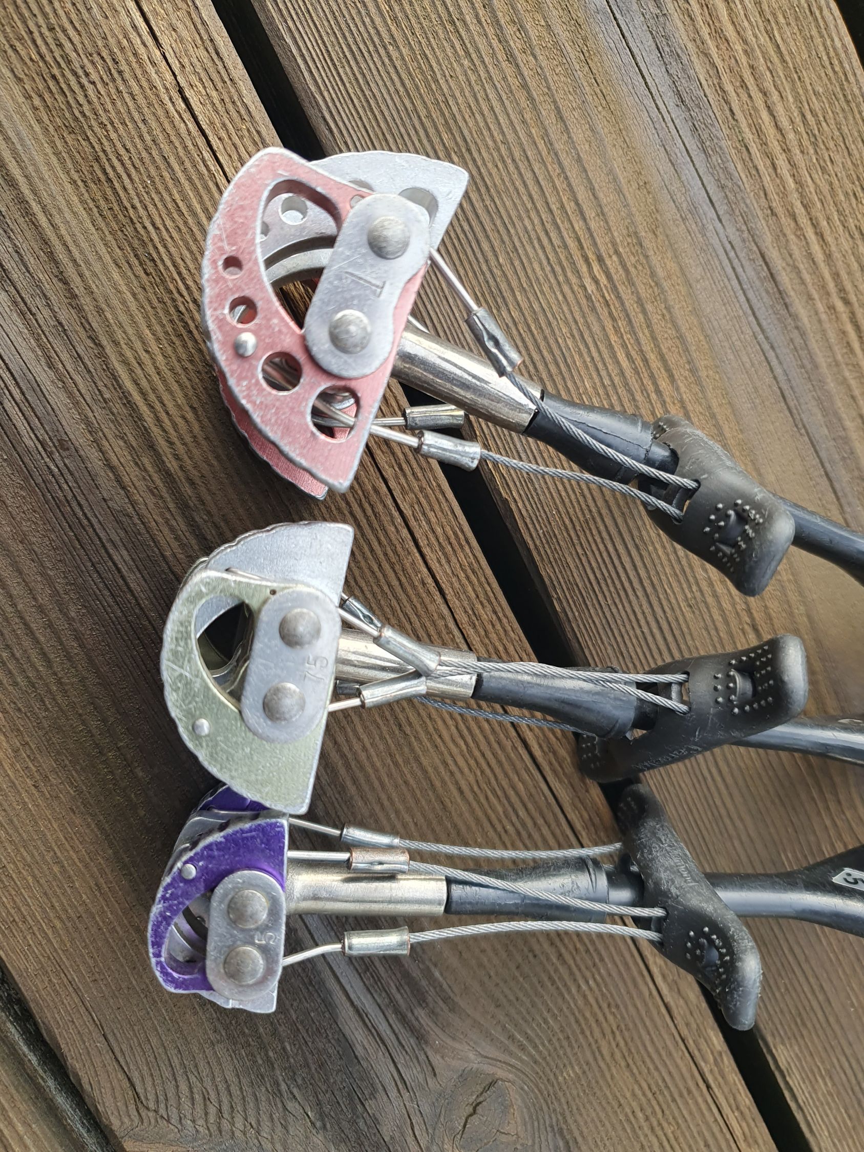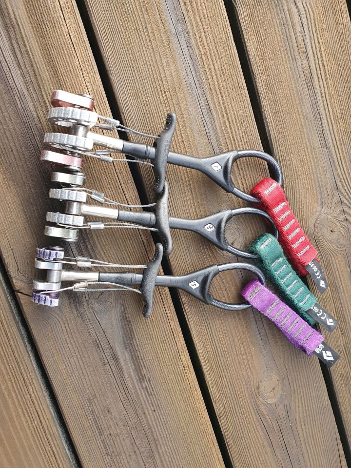Klemmgeräte (Cams) von Black Diamond als Set: 1 x Grösse 1, 1 x Grösse 0.75 und 1 x Grösse 0.5; Bandschlingen müssen ersetzt werden; VP für das ganze Set, exkl. Porto