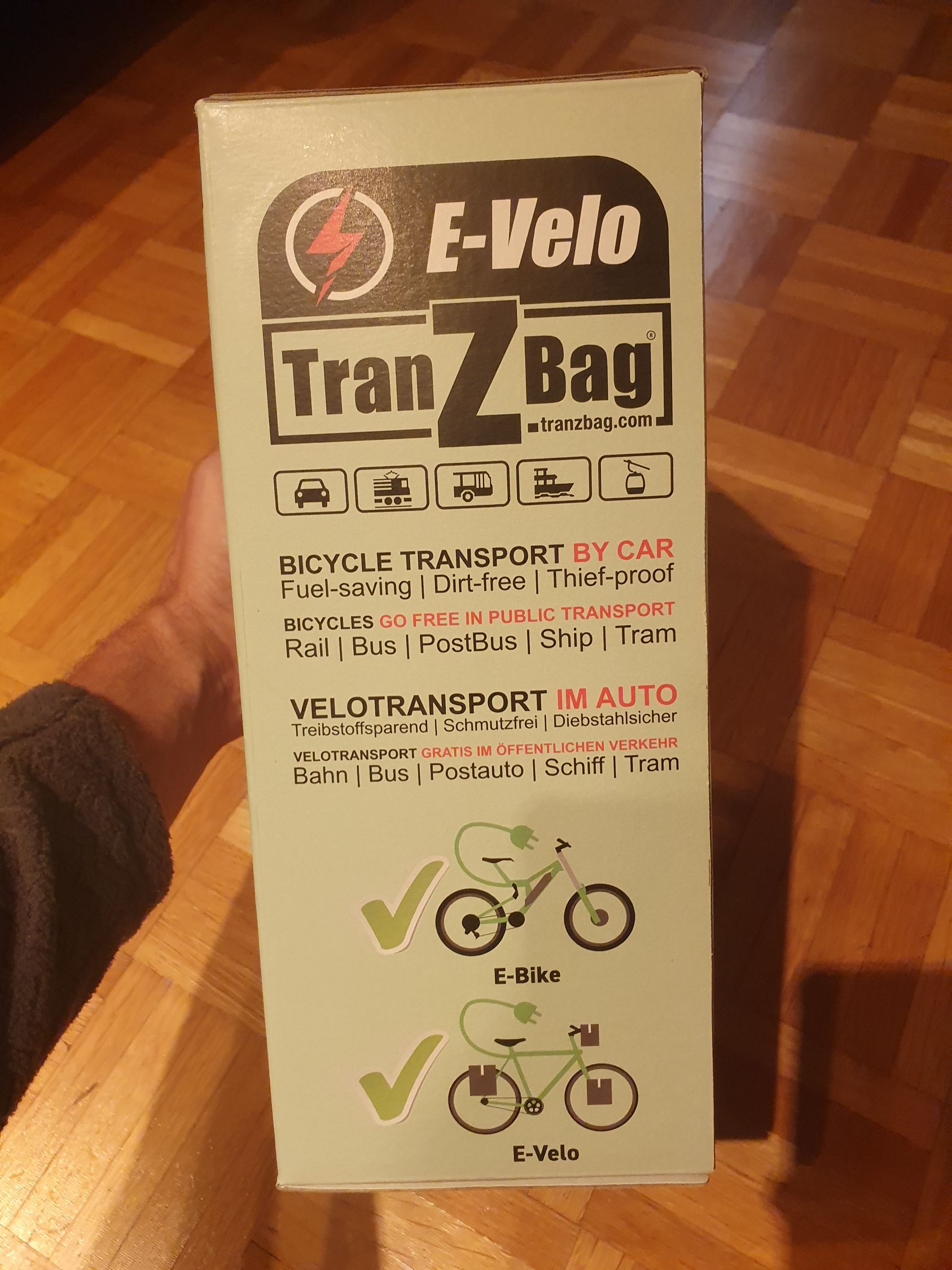 Im faltbaren Tranzbag Modell E-VELO mit 70 kg Nutzlast lassen sich alle Typen von Elektro-Fahrrädern im Auto statt am Heck oder auf dem Dach des Autos transportieren. Im Tranzbag E-VELO verpackt, können E-Bikes im europäischen Bahnsystem gratis befördert werden.