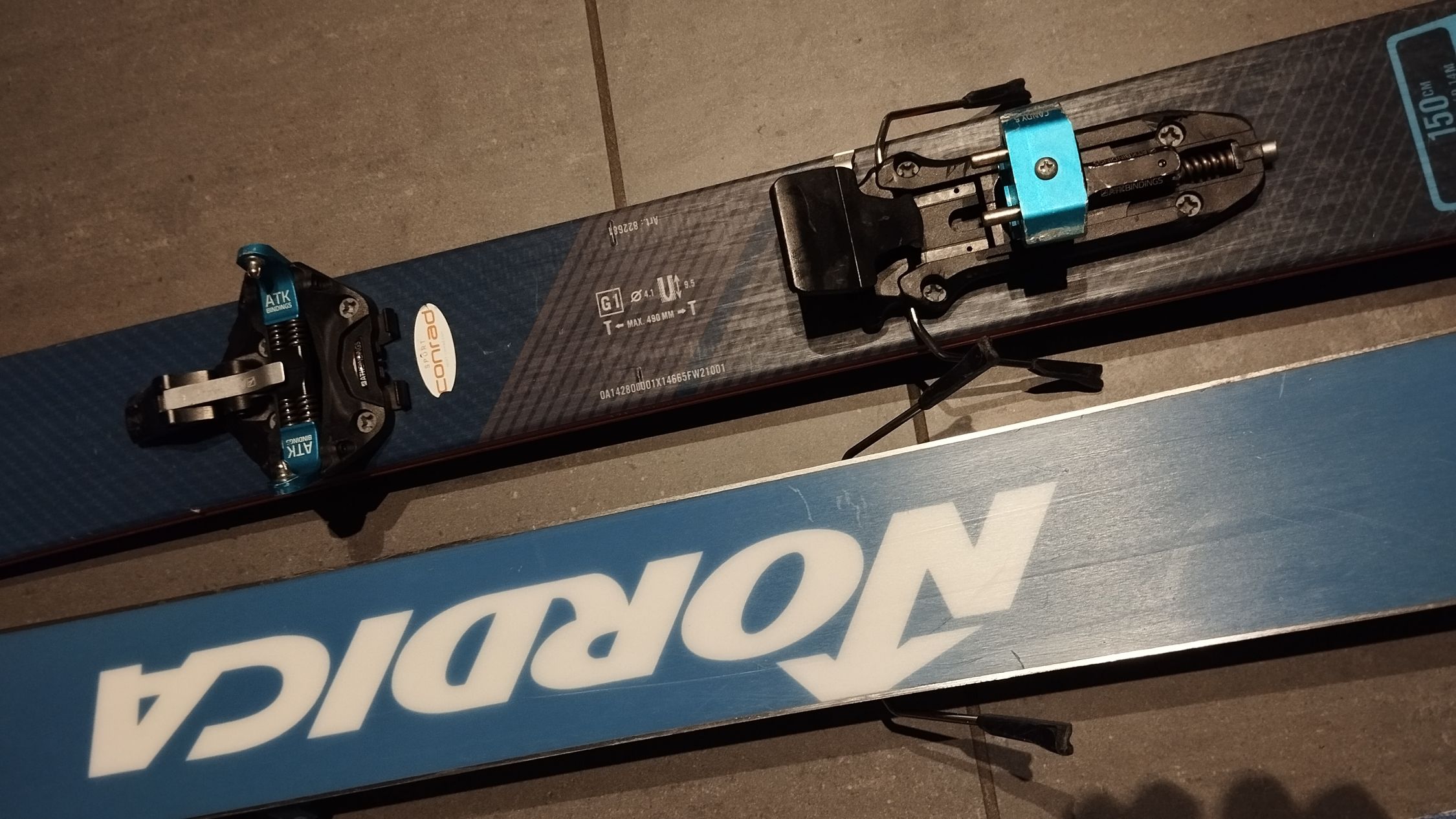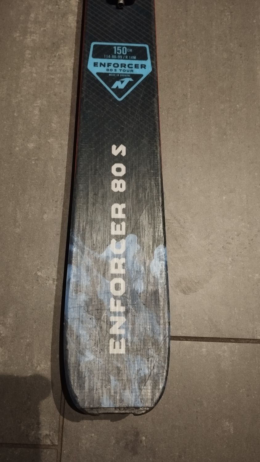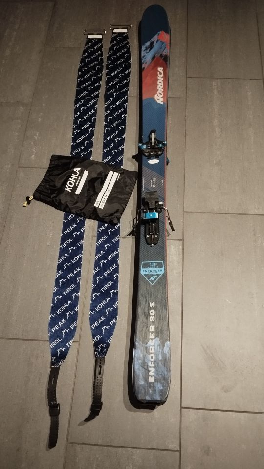 Nordica Enforcer Ski 150cm/ 80mm breit, ATK Candy Kinder Pinbindung, Kohla Fell. Die Bindung ist auf 279mm Sohlenlänge eingestellt, kann je 20mm gösser / kleiner eingestellt werden.