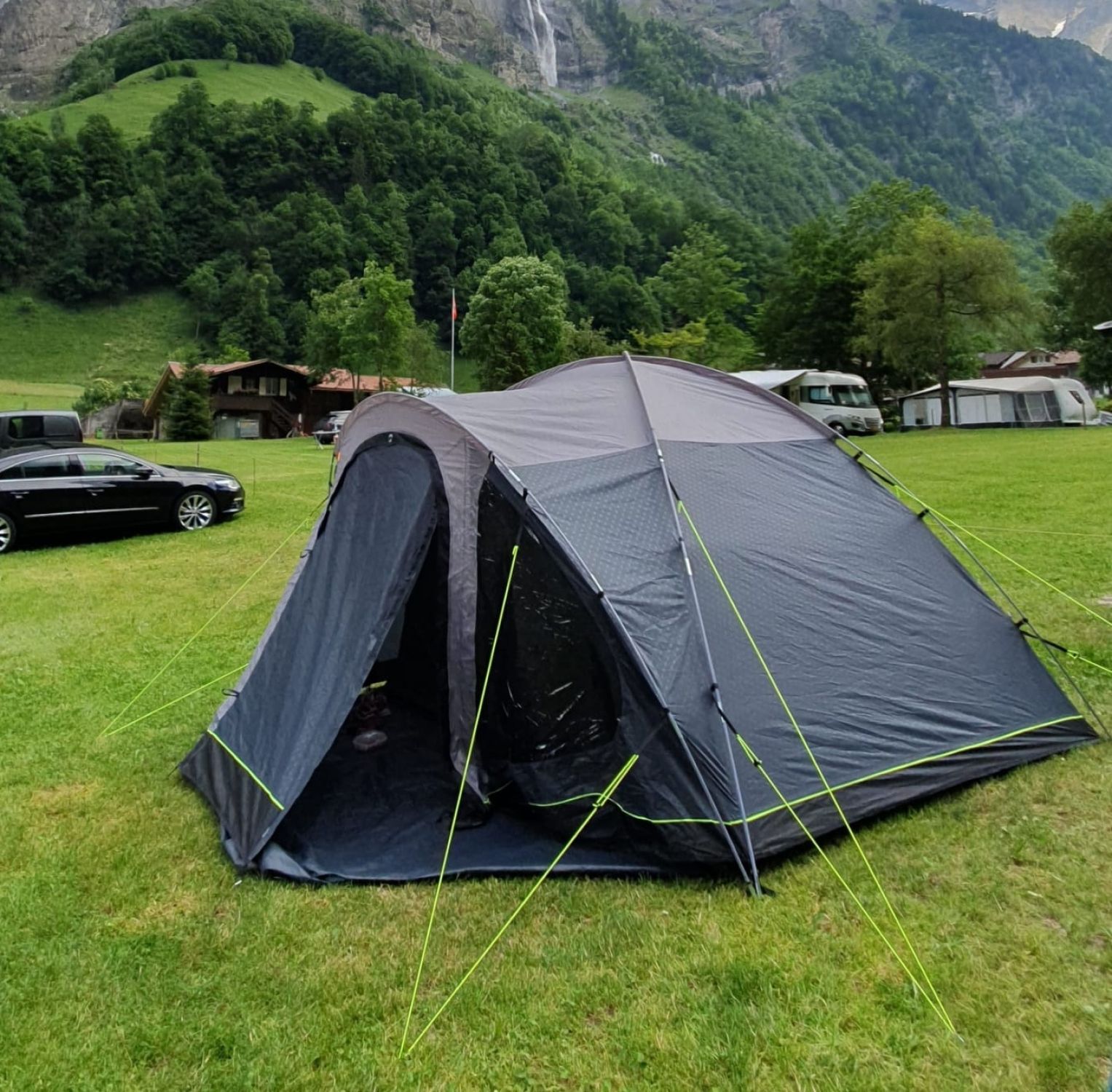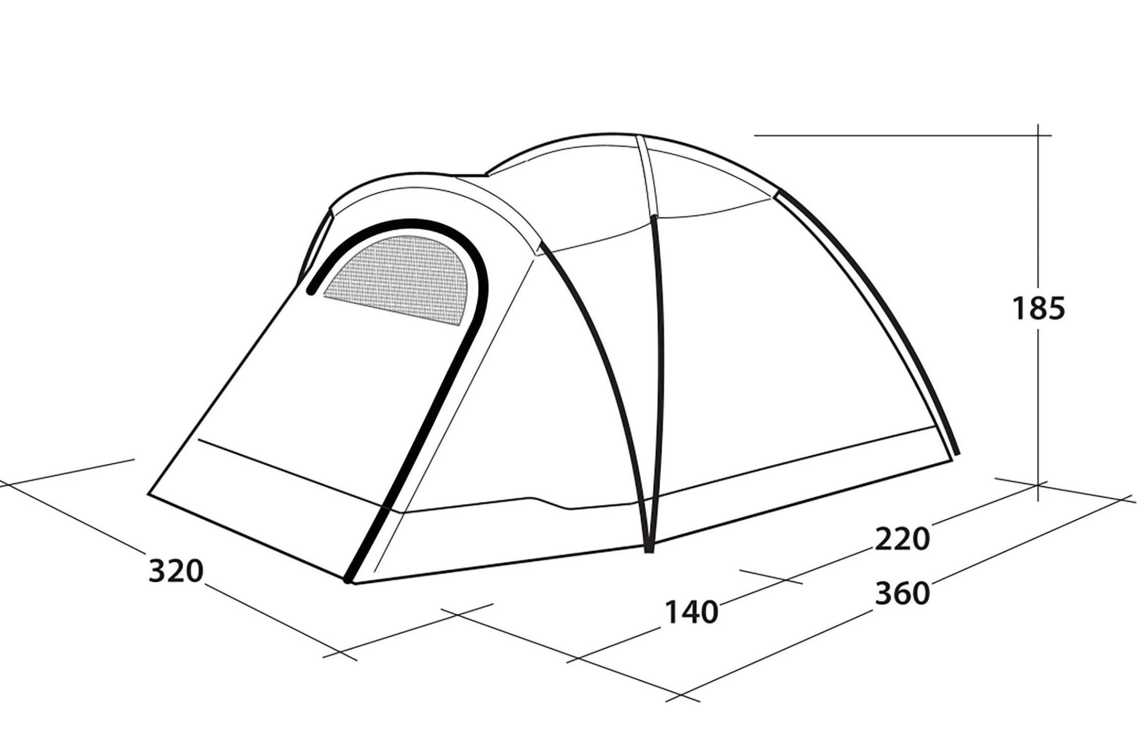 Geräumiges Kuppelzelt für 4 Personen. Vorraum, 1 Schlafkabine. Intelligentes Design mit Stangen zum Aufstellen. Stehhöhe 175 cm. Ausgezeichnete Fertigungsqualität, PFAS-freie Wasserabweisung. Wassersäule 3000 mm. Gewicht 9 kg, Packmass ca. 25x65 cm.