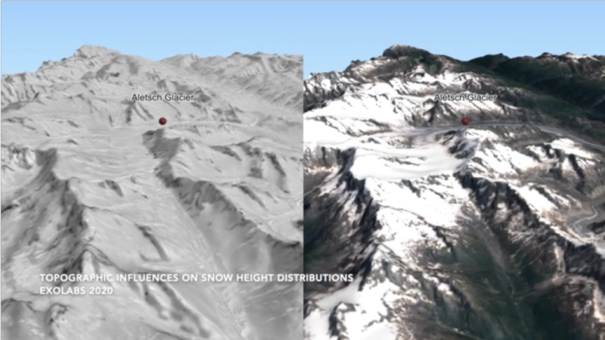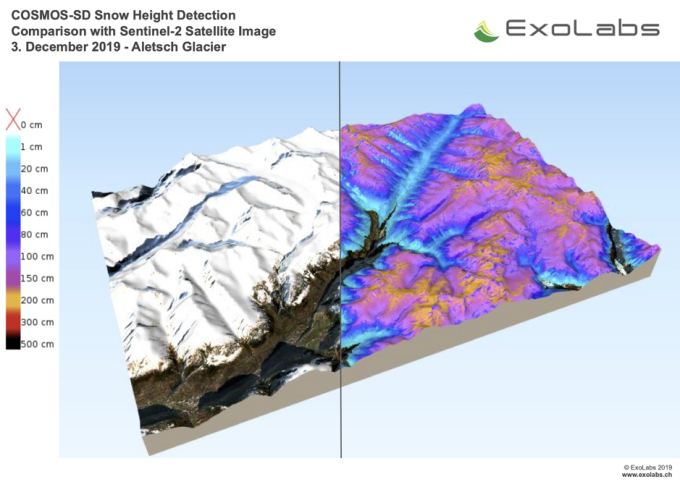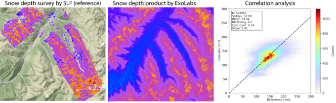 Wo gibt es wie viel Schnee? Diese Frage kommt häufig auf, wenn der nächste Ausflug in die Berge geplant wird. Viele suchen die besten Schneebedingungen, zum Beispiel für die nächste Skitour. Andere versuchen dem Schnee lieber aus dem Weg zu gehen, sei es beim Wandern oder Mountainbiken. Um einen ersten Eindruck zu erhalten, werden hierbei häufig die Bilder von Webcams verwendet. Diese liefern aber oft nur Informationen über eine Teilstrecke der geplanten Tour. Darüber hinausgehende Informationen zu den tatsächlichen Schneehöhen findet man auch nur punktuell an Lift- und Bahnstationen in Skigebieten oder für einzelne Wetterstationen. Um einen flächendeckenden Überblick über die aktuelle Schneesituation zu gewinnen, hat das Team von ExoLabs eine innovative Lösung basierend auf Satellitendaten und Bodenmessungen entwickelt.