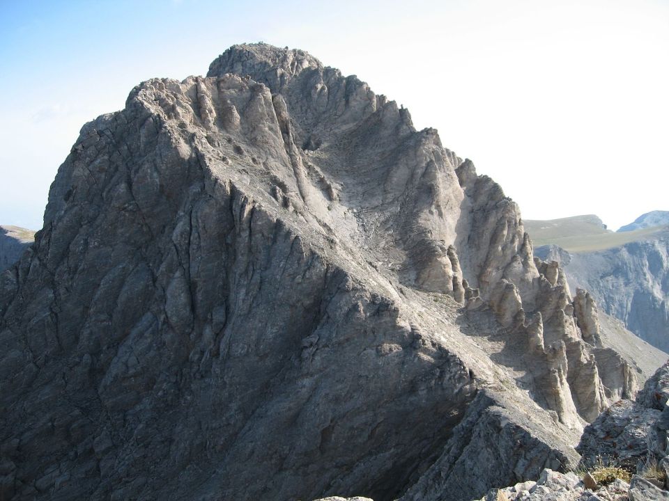 Olymp: Der höchste Gipfel ist der Mytikas (auch: Mitikas) (2918 m), gefolgt von den Gipfeln Skolio (2911 m), Stefani (2909 m, gelegentlich als „Zeusthron“ bezeichnet) und Skala (2866 m). Zwischen Skala und Mytikas befindet sich Kakoskala, ein Grat, über den der Mytikas durch leichte Kletterei erreicht werden kann. Auf dem Nebengipfel Profitis Ilias befindet sich die höchstgelegene Kapelle der Balkanhalbinsel. Der Gebirgsstock weist eine ganz eigene Flora und Fauna auf. Deshalb wurde er schon 1938 unter Naturschutz gestellt und 1981 von der UNESCO zum Biosphärenreservat erklärt. Text Wikipedia.