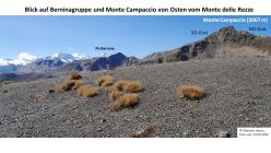 Der Monte Campaccio bildet mit dem Munt Cotschen im W und dem östlich liegenden Pizzo Cantone und Monte delle Rezze den südlichen Abschluss des Val Federia. Dieser Stützpfeiler zweigt von der Wasserscheide zwischen dem Val di Livigno und dem Engadin in der Nähe des P. 2982 m ab, der auf einigen Karten Matòc dal Mont genannt wird. Der dort Richtung Osten führende Grat steigt nach einer Absenkung zum P. 2982 m (Pizzo dei Gessi) an, um sich nach einer erneuten Gratsenke letztlich im pyramidenförmigen Monte Campaccio (3007 m) zu erheben. Auf dessen Spitze steht ein Steinmannn. Der Berg ist über den NO-Grat auf einem ausgetretenen Pfad leicht zu ersteigen. Über den SO-Grat kann man - überwiegend auf Rasenmatten -sehr leicht zur Cascina del Monte und weiter zur Alpe Campaccio in die Talsohle von Livigno absteigen, so dass sich eine Überschreitung am ehesten mit Aufstieg über den NO-Grat und Abstieg über den SO-Grat anbietet.