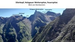 Von der Wetterspitze zieht ein langer Kamm nach N, der das Sulzltal vom Grießltal und dem untersten Madautal trennt. Der höchste Gipfel im Kamm ist der eher selten bestiegene Etlerkopf (Aptychenkalk). Von der Schafscharte zieht der S-Grat hinauf. Der scharfe O-Grat trägt die schlanken, wilden Pleisspitzen (2654 m). Der NW-Grat wird als Abstiegsweg (rot markiert) genutzt, an den nördlich der Pleiskopf anschließt. Dieser bildet auf seiner S-Seite ein schulterförmiges Plateau, das mit Geröll überzogen und rund wie ein Wal- bzw. Elefantenrücken ist.
