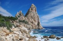 Eine hohe „Kalksteinpyramide“, die aus dem Meer ragt, ein Naturdenkmal an der Ogliastra-Küste von Baunei, im zentralöstlichen Sardinien, ein Ziel für Trekking- und Kletterbegeisterte.