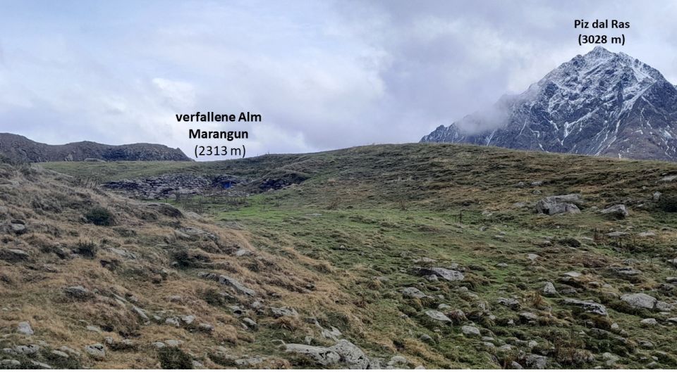 Verfallene Alm im Norden bzw. Osten vom Val Fless. Wegpunkt auf dem Anstiegsweg zum Piz Fless (S-Seite), Piz Murtera (O-Seite)