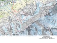 (b) direkt durch Schnee/Geröll (später über einen Moränenrücken) weiter nach N Richtung P. 2086 m absteigen, wo man unterhalb auf Wegspuren trifft, die zur Brücke über die Lonza (1771 m) und zur Postbushaltestelle am Parkplatz bei Gletscherstafel leiten.
