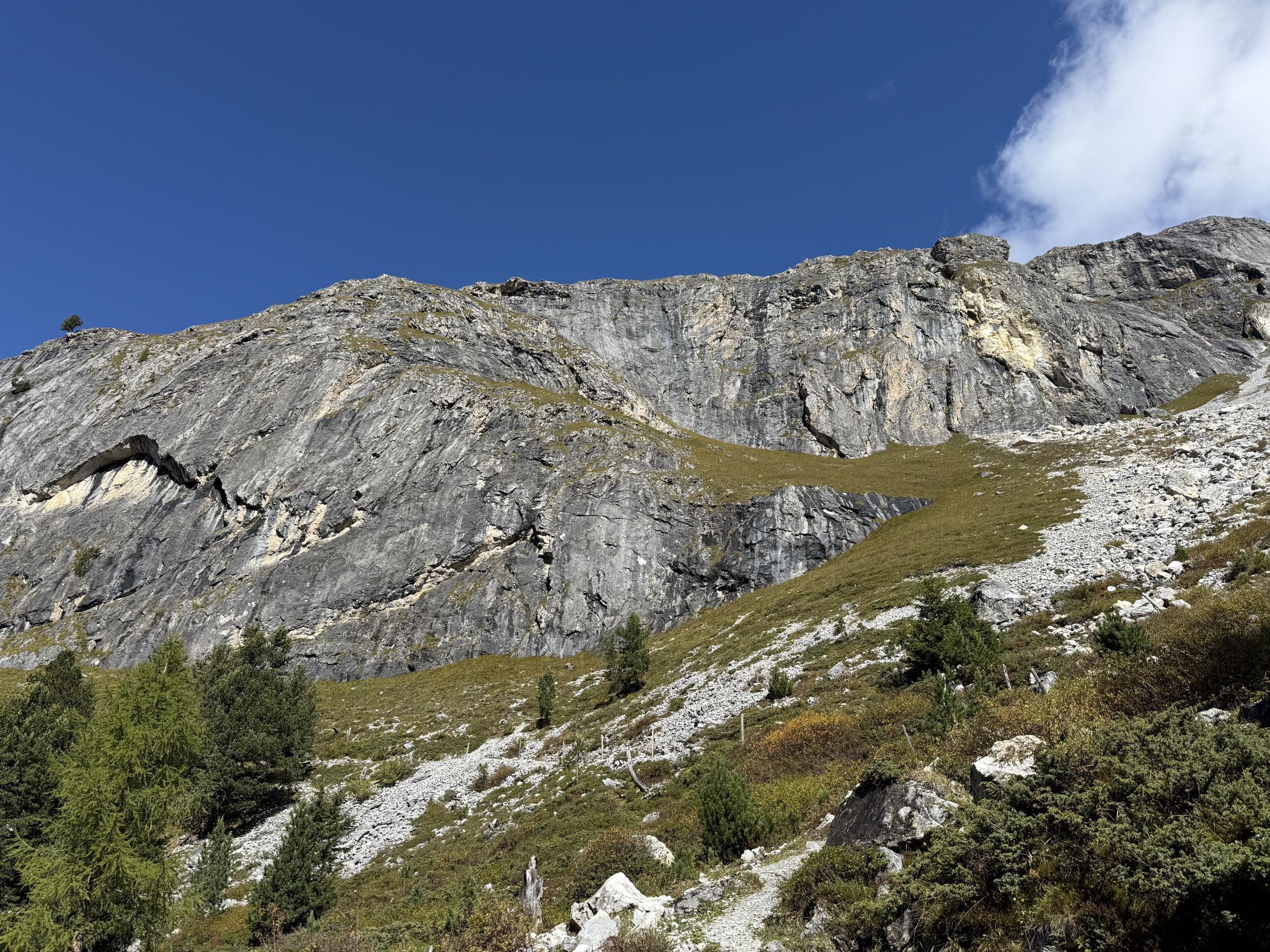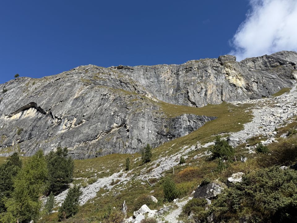 Langer Grat, der bei Cuziranch 2200 m beginnt und sich bis zum Gipfel 3015 m erstreckt. Markant sind die Felswände am Anfang des Grates mit gebohrten Kletterrouten (Bernhard Fallet).