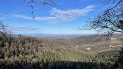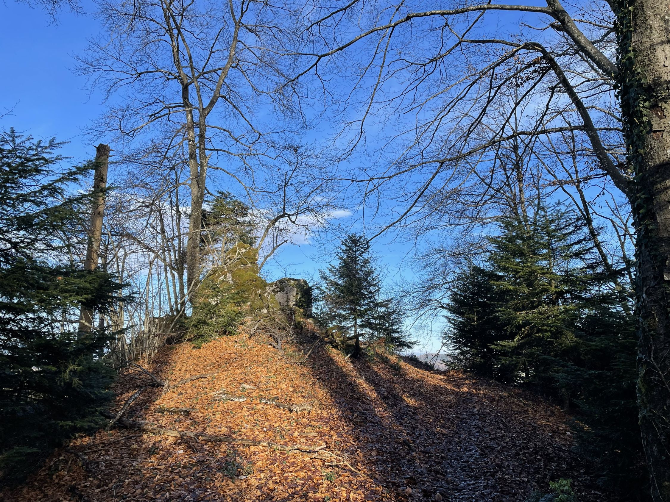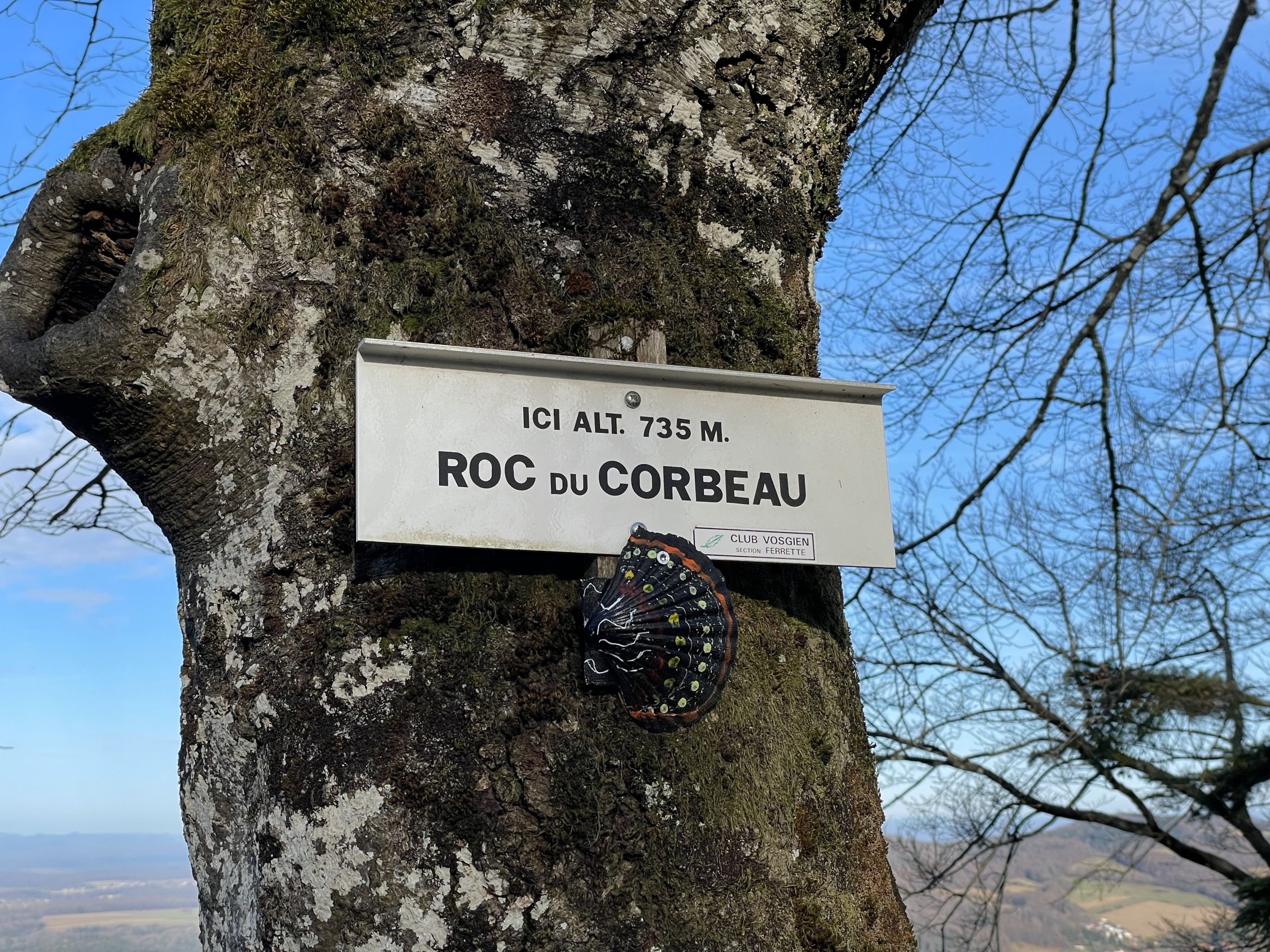 Der höchste Punkt bietet leider keine grosse Aussicht. Er ist mitten im Wald. Der etwas östlich davon gelegene Punkt 735m(auf Karte nicht eingetragen) hat dafür ein Bänklein und bietet grandiose Sicht in das Elsass und den Grand Ballon. Dieser trägt denn auch mit einem Schild den Namen Roc du Corbeau. Dieser hat auch historische Bedeutung. Im Juli 1826 fanden sich dort Xavier Stockmar, Louis Quiquerez und Olivier Seuret und schworen "den Jura von der Berner Oligarchie zu befreien". Dieser Akt war der Ausgangspunkt des Kampfes, der 1979 zur Gründung des Kantons Jura, des 23. Schweizer Kantons, führte.