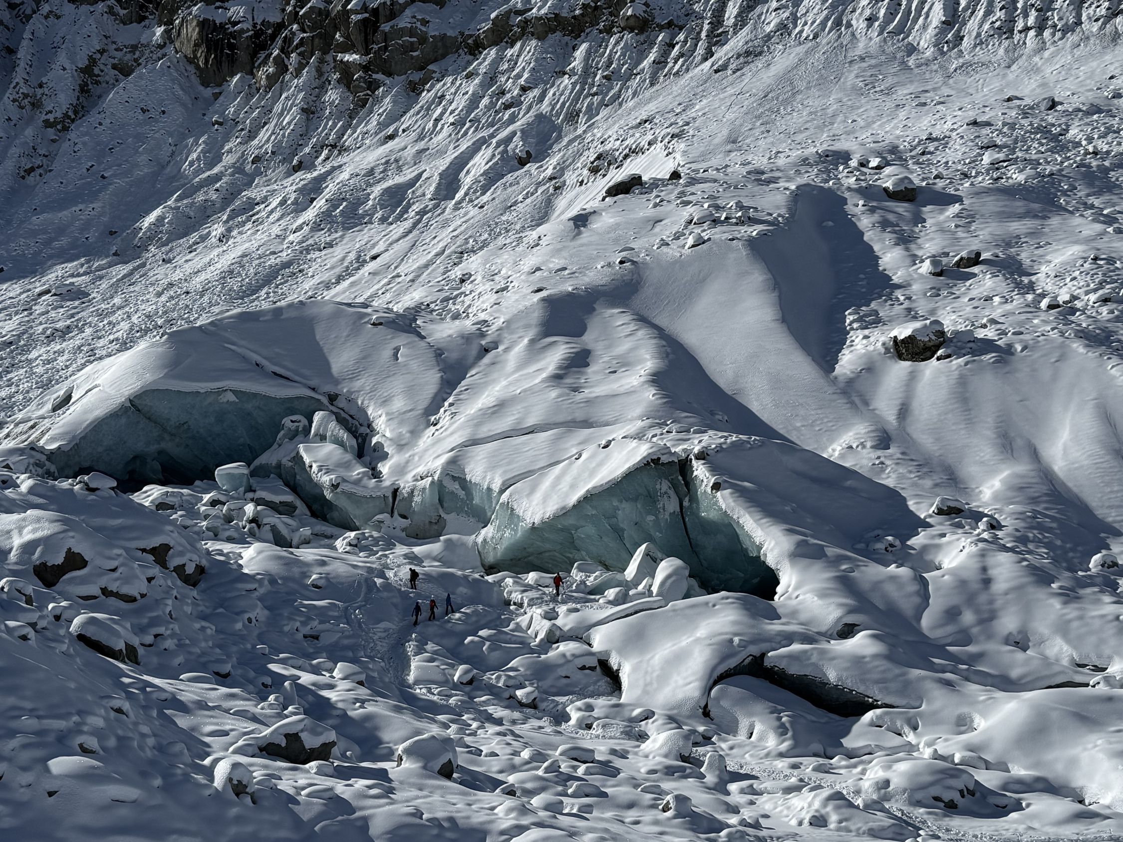 Gletscherzunge Vadret da Morteratsch unweit grossem Fels Punkt 2167, links davon die spektakulären Gletschertore.