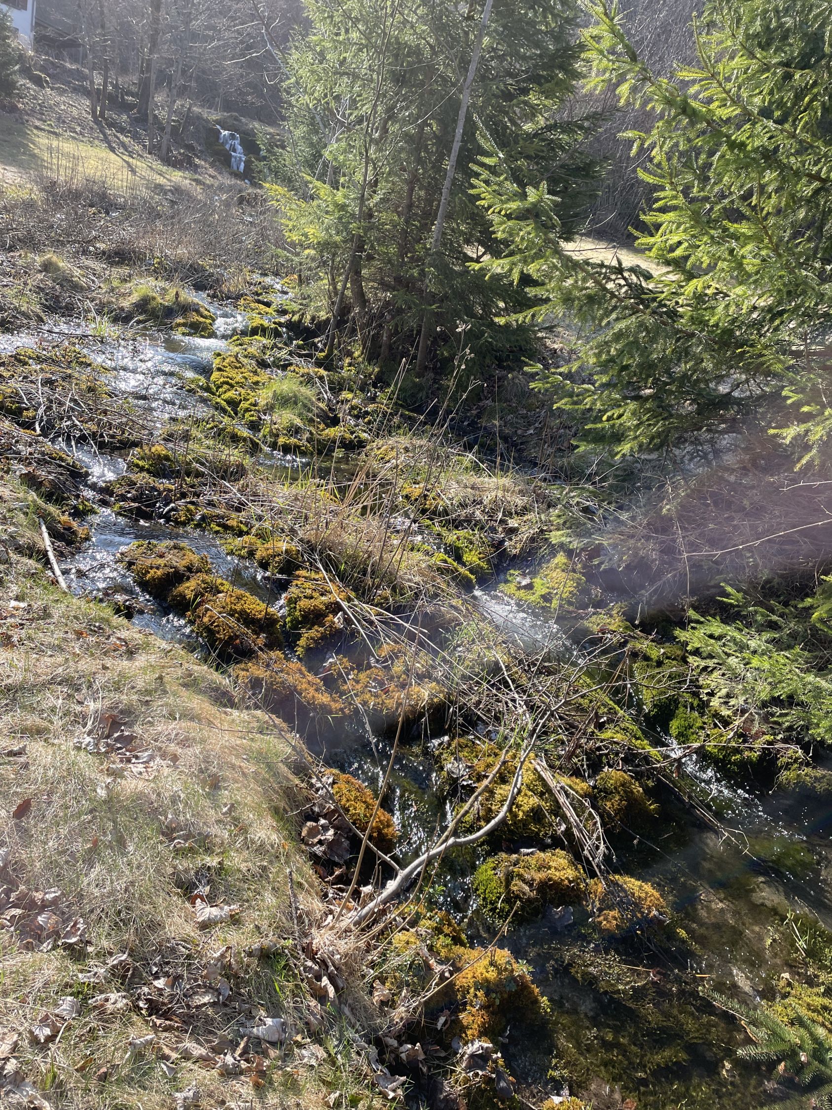 kleiner vermooster Wasserfall im oberschwäbischen Hügelland, der nordwärts in die Wolfegger Ach mündet