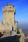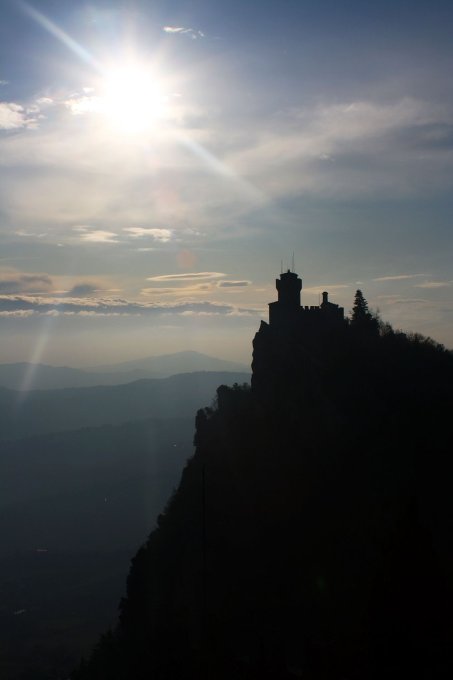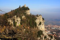 Der Monte Titano hat eine Höhe von 756m, somit ist der Berg höher als die Landeshöhepunkte einiger viel grösseren europäischen Staaten wie Belgien, Weissrussland oder Estland. San Marino ist die älteste Republik der Welt, als Gründungsjahr gilt der 3.9.301. Der Name kommt von Marinus, einem christlichen Bauarbeiter von der kroatischen Insel Rab. Marinus kam im Jahre 300 ins aufstrebende Rimini. Bevor Kaiser Diokletian im Jahre eine grausame Christenverfolgung durchführte, floh im Jahre 301 Marinus auf den Monte Titano. Bald darauf gesellten sich weitere Verfolgte zu ihm und gründeten eine christliche Kolonie auf dem Monte Titano. 311 wurde seiner Gemeinschaft von zum Christentum konvertierten Patrizier aus Rimini der Monte Titano geschenkt und San Marino war seitdem formell unabhängig. Traditionell dem Erbe von Marinus verpflichtet, nahm San Marino im Laufe der Geschichte Verfolgte auf und bot ihnen Schutz. So entstanden im Laufe der Zeit auf dem Gratkamm des Monte Titano drei grosse Wehrburgen. Auf dem höchsten Punkt steht die Burg Rocca Cesta oder La Seconda Torre, sie kann zusammen mit der nördlich gelegenen Burg La Prima Torre / Castello della Guaita (738m) für einen kleinen Eintrittspreis von 4,50 Euro besichtigt werden. Von den Burgen hat man eine hervorragende Aussicht über das ganze Land und weiter bis zum Meer!
