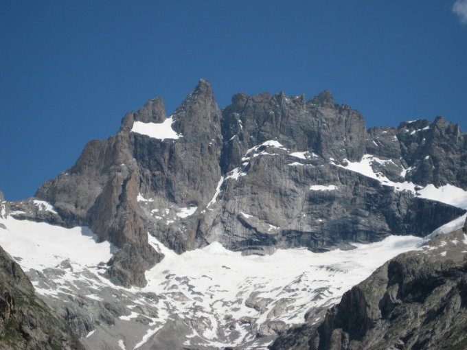 Berg im Parc National des Écrins mit mehreren Gipfeln: Pic du Glacier Carré (3862 m), Grand Pic (3983 m), Dent Zsigmondy (3936 m), Doigt de Dieu (3973 m). Die Überschreitung der Meije vom Ref. du Promontoire zum Ref. de l'Aigle ist eine große, klassische Tour.