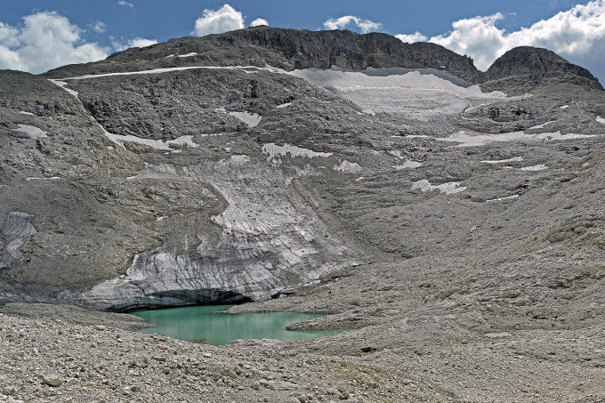 Nordostwärts eingelagert finden sich die in mehrere Lappen zerfallenen Reste des Ghiacciaio di Fradusta.