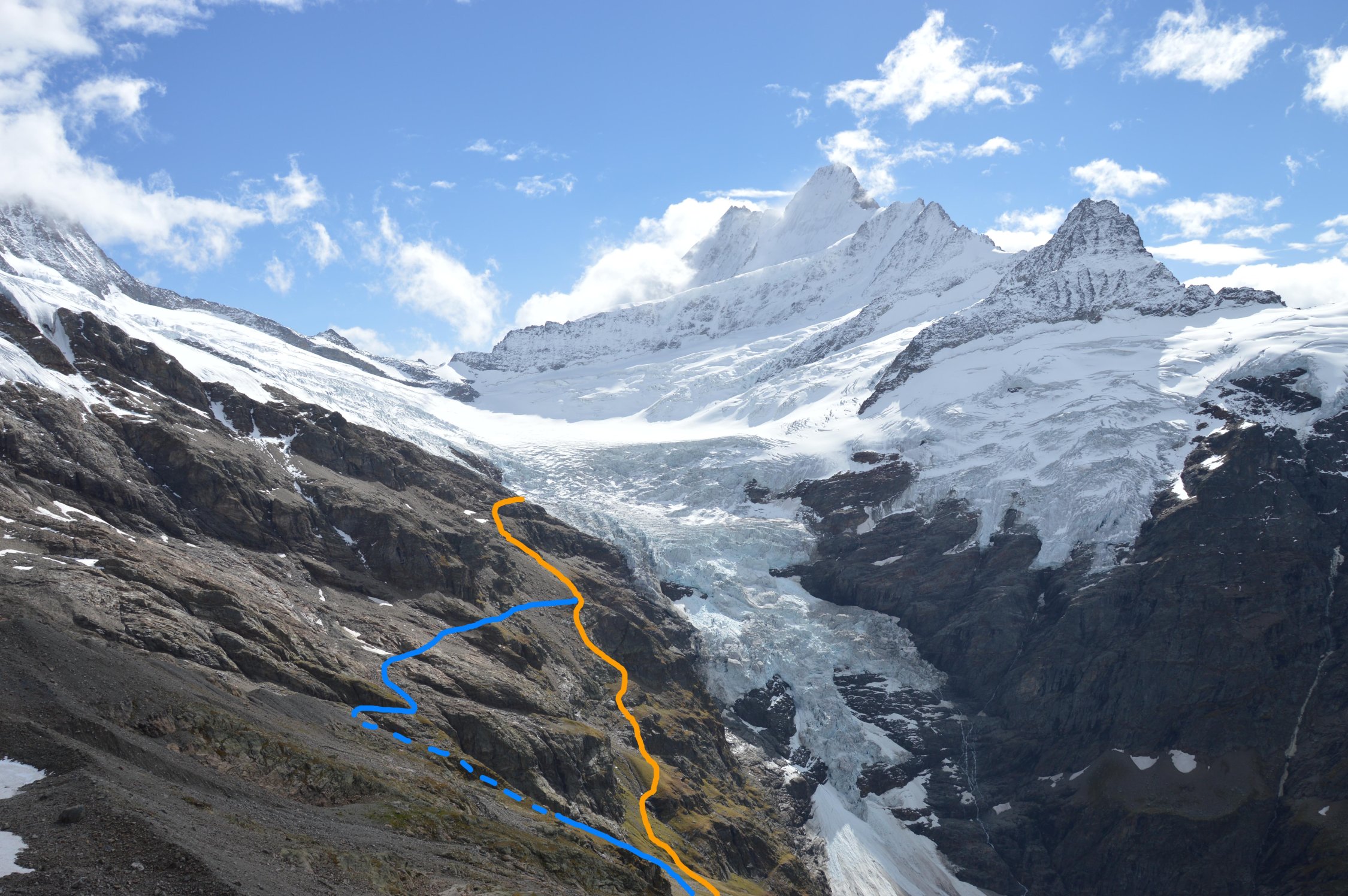 Als Anmarsch zum Gletscher in der Dunkelheit am Morgen zu den hochalpinen Touren wie Rosenhorn, Bärglistock, Lauteraarsattel, Gr. & Kl. Schreckhorn und Gwächtejoch, empfiehlt sich jedoch das besser findbare und gut eingerichtete "Bisi Hänsels Wägli".