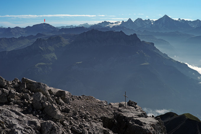 Von Nordwest bis Nordost reihen sich die Gipfel der Chablais-Alpen. Es folgt bis Ost das Haupttal des Wallis, umrahmt von den Berner und Walliser Alpen.