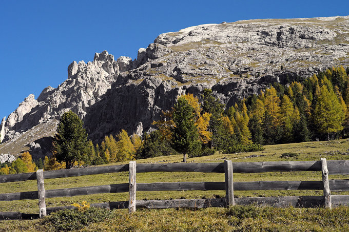 Der Kreuzkofel-Lavarella-Kamm schliesst daran an, dahinter die Presanellagruppe. Im Westen weitet sich danach die Fernsicht bis in die Ortleralpen, die Ötztaler und Stubaier Alpen.