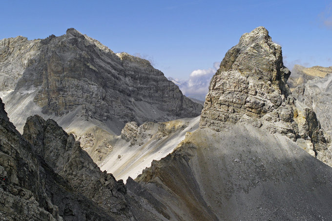 Die Splügener Kalkberge sind aus Dolomit und marmorisiertem Kalkstein der Triaszeit gebaut. Von der unsäglichen Brüchigkeit des Gesteins zeugen die gewaltigen Schutthalden um die Gipfel.