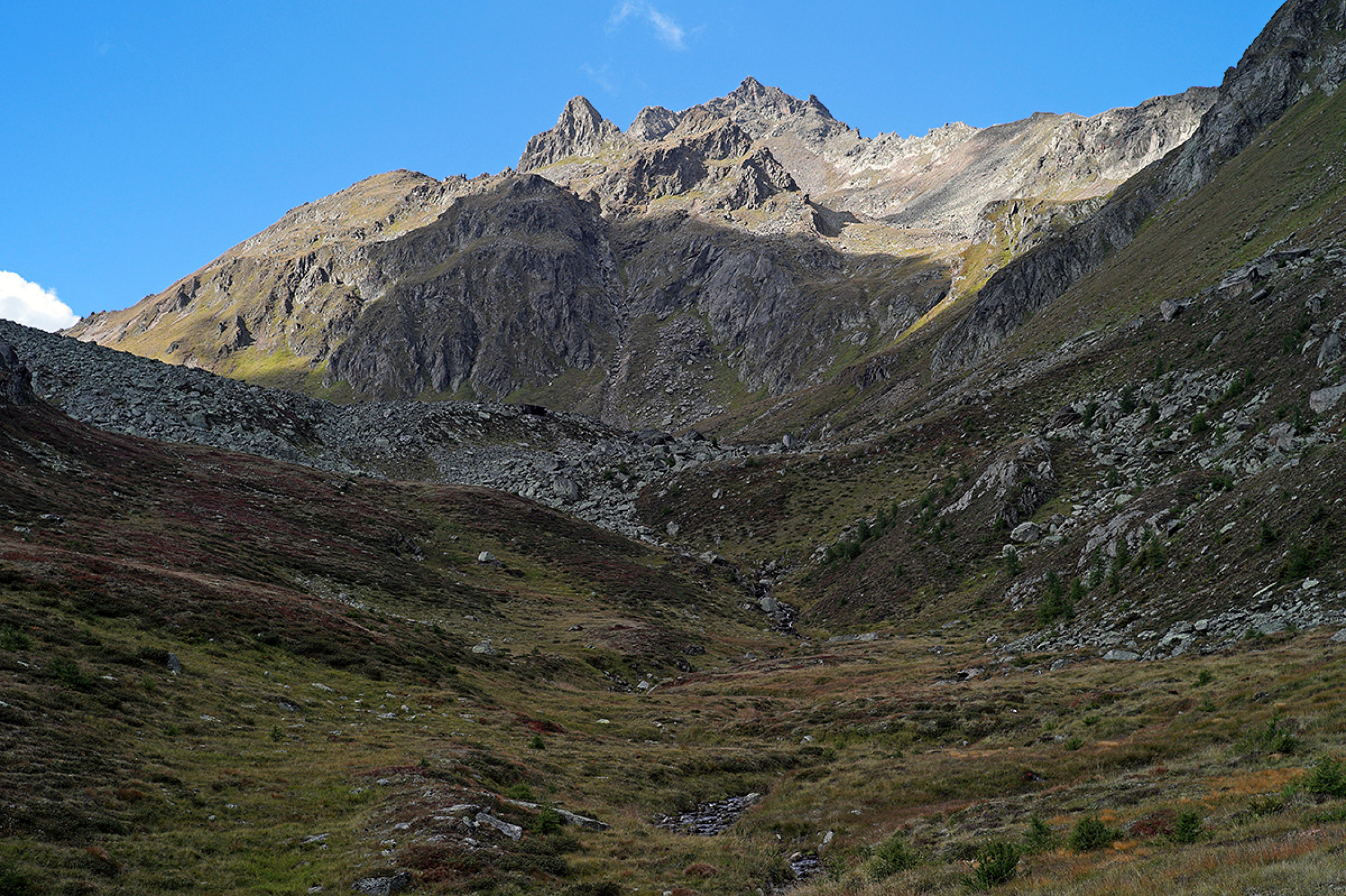 Von Südosten zieht ein Schuttkessel bis unter die hier kurze Gipfelwand. Im Nordosten ist mit dem Mörnigtal ein weiterer hochreichender Schuttkessel eingelagert.