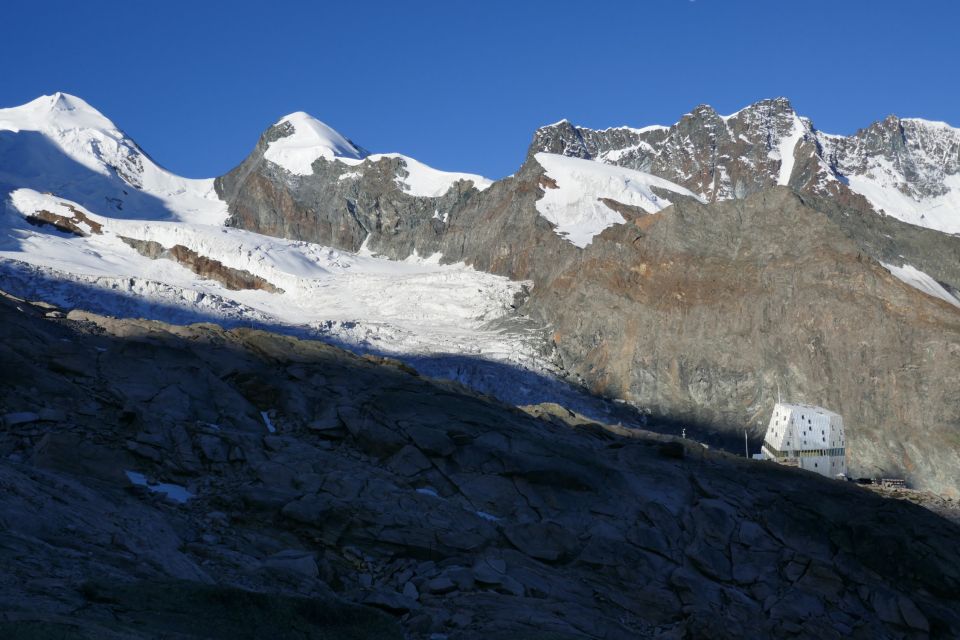 Gletscher. Die Hütte steht am Ort «Platje», am Fusse des Monte Rosa Massivs und ist ein idealer Startpunkt der vielen 4000er-Gipfel im Monte Rosa Gebiet: z. B. Dufourspitze, Nordend und Lyskamm.