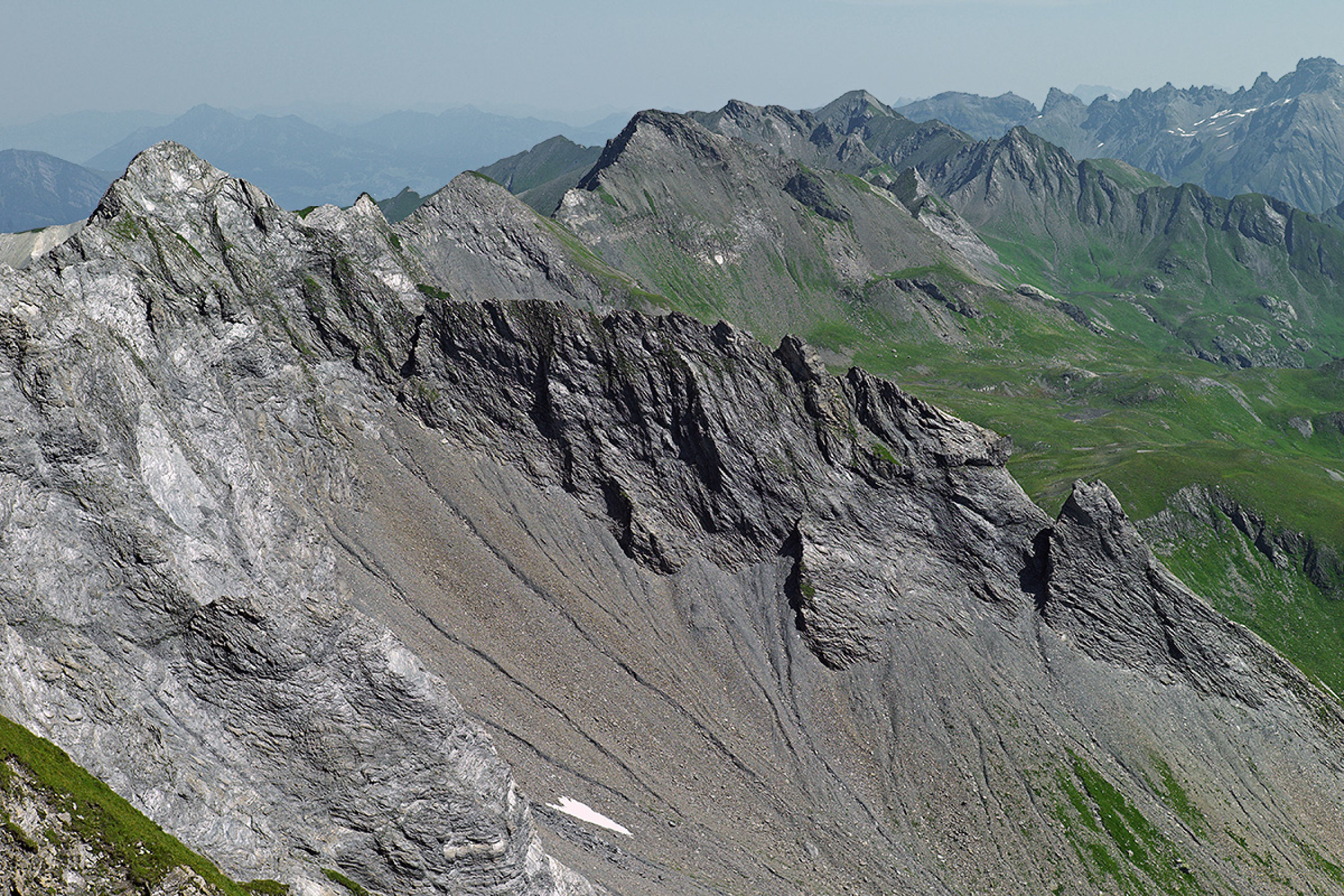 Am Gipfel treffen sich vier Grate. Der Südwestgrat zum Gspaltengrat (2625 m) besteht aus Schutt, Schrofen und im Gipfelbereich brüchigem Fels. Der wenig ausgeprägte Nordwestgrat senkt sich ins Muottätal. Der im Gipfelbereich schwierig zu begehende Nordostgrat stellt die Verbindung zum 1,25 km entfernten Fahnenstock (2612 m) her. Der Südostgrat schliesslich bildet die fast schon abenteuerlich geformte Trennmauer der Kare von Sardona-Chrazeri und Hinder Chrazeri.
