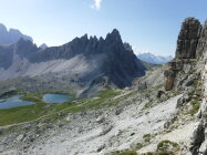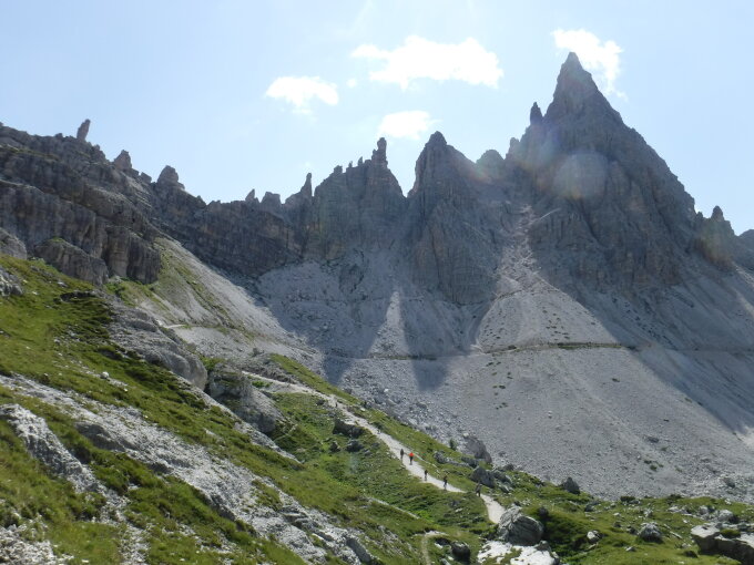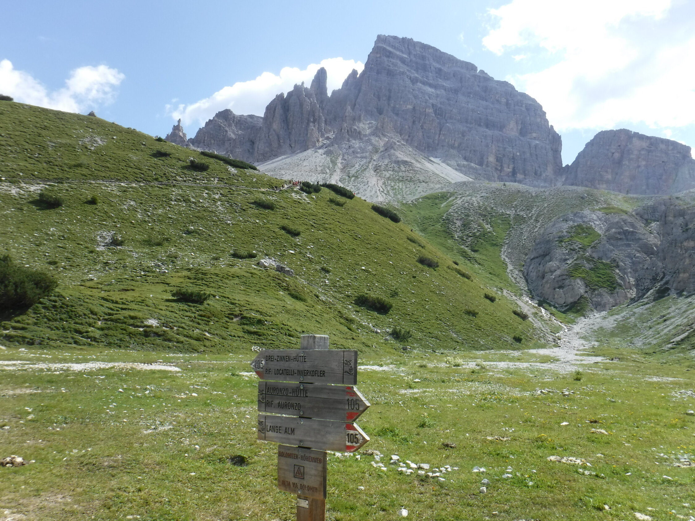 Prächtiger und viel besuchter Logenplatz für die Nordwände der 3 Zinnen. Der Gipfel liegt auf der Grenze Südtirol - Veneto und war im 1. Weltkrieg stark umkämpft, dementsprechend ist der Berg von Tunnels und Kavernen durchlöchert und auf allen Seiten mit Kriegssteigen und Stellungsresten versehen.