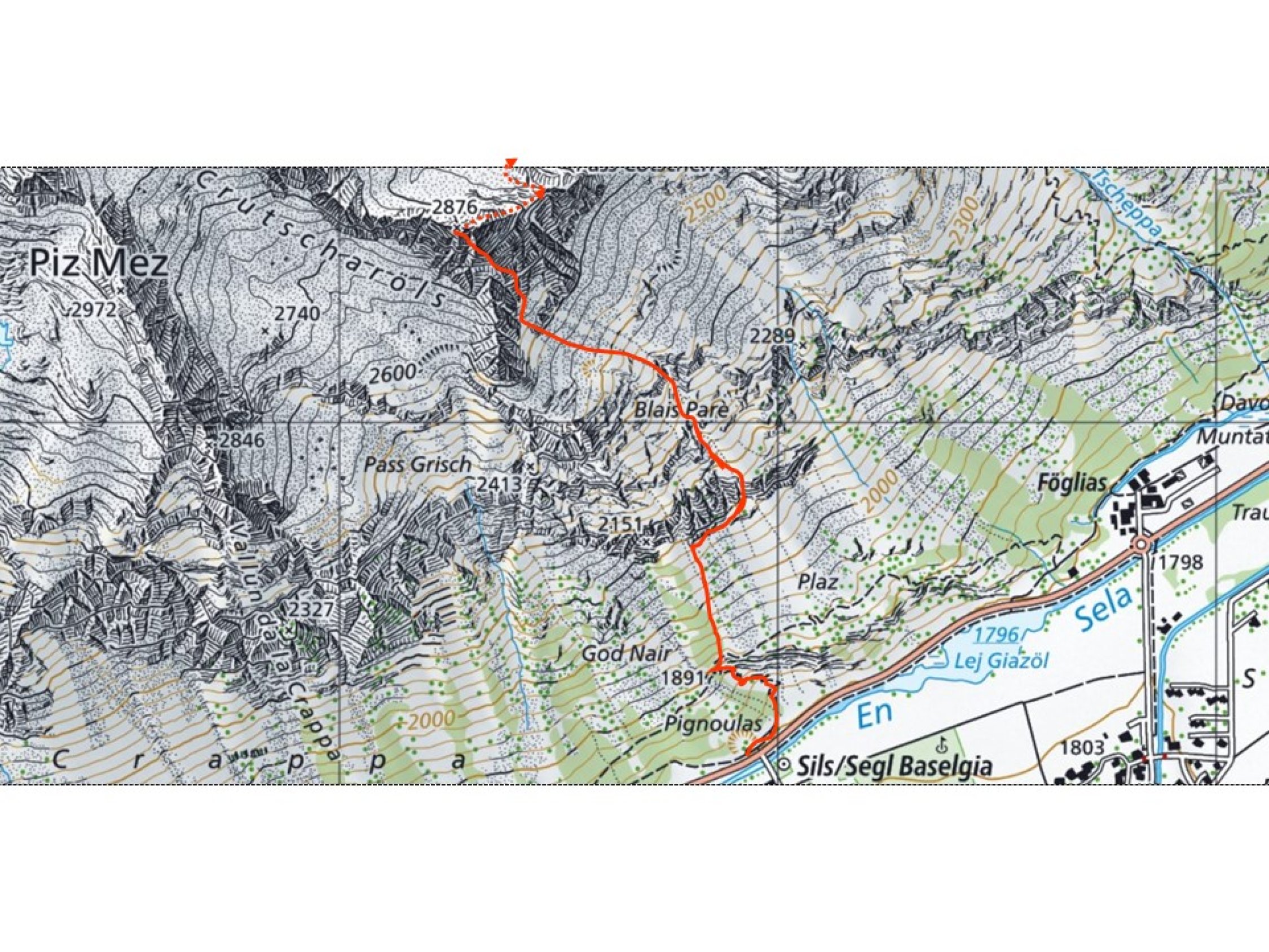 SO-Gipfel der Crutscharölsgruppe. Er bildet mit dem Südgipfel (P. 3082 m) des Piz Lagrev und dem Piz Mez (2972 m) bzw. dessen Vorgipfel (2846 m) das Felsgipfel-Dreigestirn der Südseite von Sils-Maria