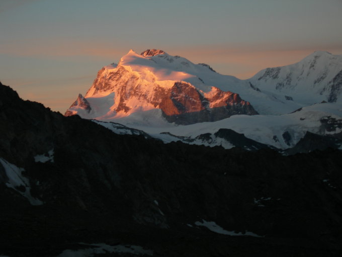 Monte Rosa ist ein Massiv in dessen Mitte die Dufourspitze steht als höchste Erhebung auf Schweizer Boden.