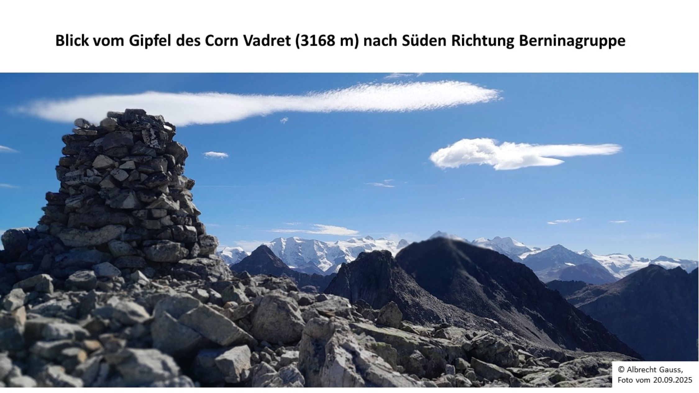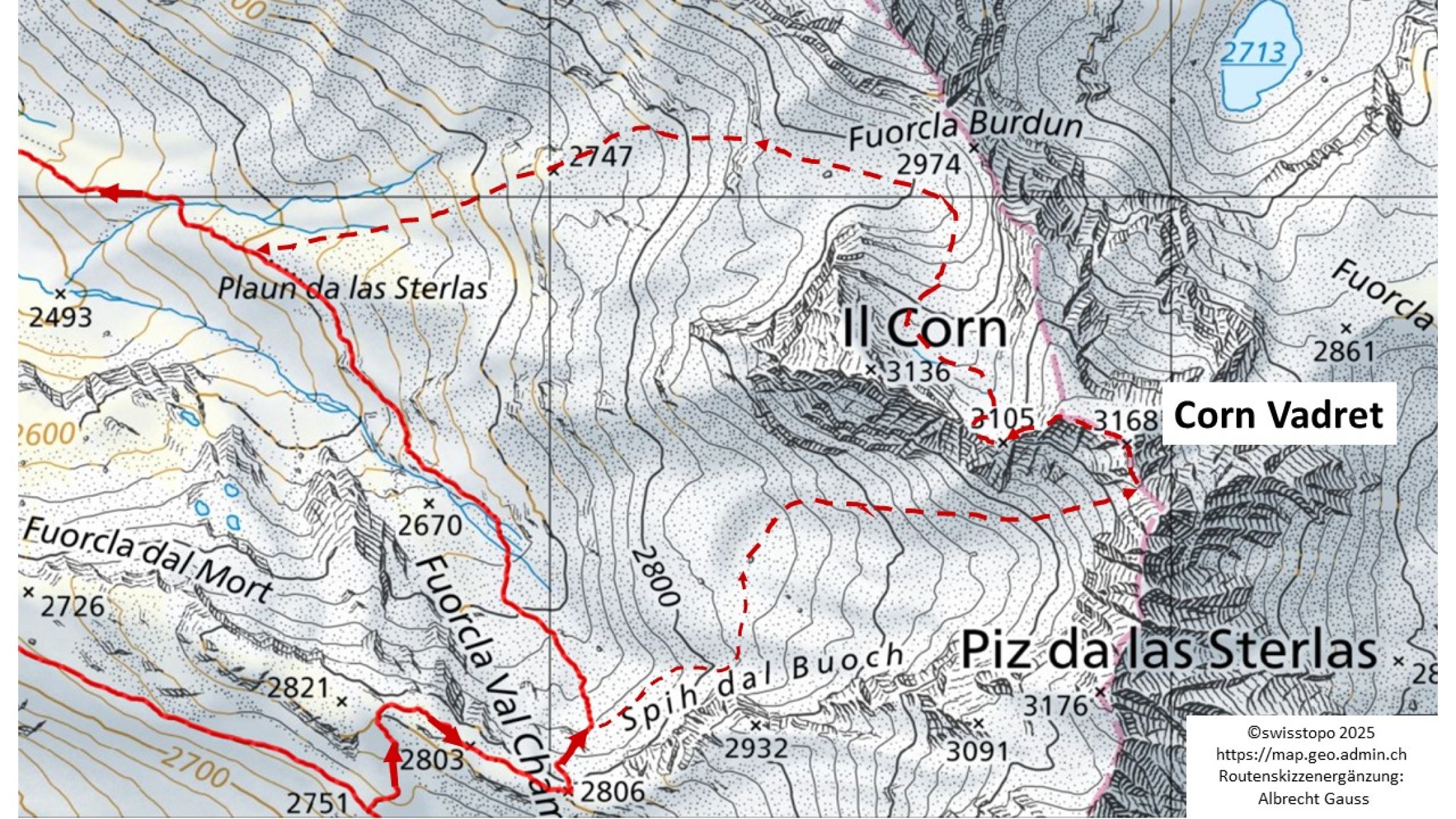 Der "Corn Vadret" wird von einem fast als monumental zu charakterisierenden Steinmann gekrönt. Dieser stammt wohl aus einer Zeit, wo der Gipfel auch im Sommer relativ leicht über den bis auf ca. 2900 m nach N herabreichenden Gletscher (im Clubführer von 1984 als Vadret dal Corn, inzwischen in der LKS als Chüdera da Corn bezeichnet) zwischen Il Corn und Corn Vadret erstiegen werden konnte. Ende des 20. Jahrhunderts kam es zu einer massiven Progression des Gletschersterbeprozesses mit Hinterlassung übler Geröllwüsten in der Nordflanke, deren Überwindung mühsam und zeitraubend ist. Die in der LKS (map.geo.admin.ch, Zugriff Oktober 2025) ca. 70 bzw. 180 m nördlich von P. 3105 m noch eingezeichneten Gletscherreste waren bei deren Leichenschau am 20.09.2025 (jedenfalls oberflächlich) nicht mehr wahrnehmbar, so dass der Tod auch dieses Gletschers definitiv festzustellen ist. Bis ca. 1991 gab es auch noch einen Vadret da las Sterlas auf der SW-Seite des Corn Vadret bzw. in der NW-Flanke des Piz da las Sterlas (s. https://map.geo.admin.ch/Dargestellte Karten/Zeitreise - Kartenwerke).