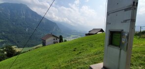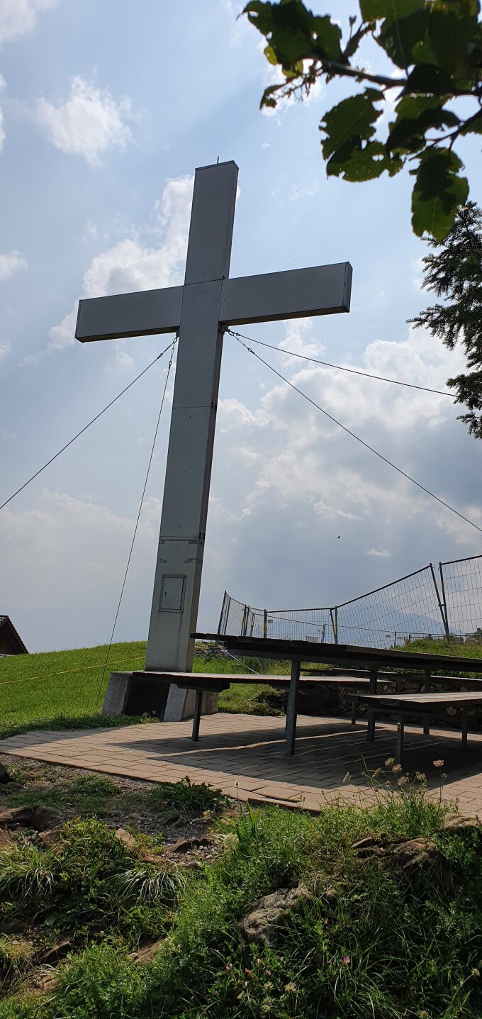 Auf dem Gipfel hat es ein grosses Kreuz einen Grill und Tisch.