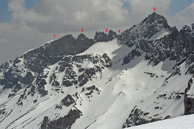 Von der Clariden- oder der Planurahütte über den Claridenfirn, das Gemsfairenjoch (Punkt 2848) und den Westgrat.