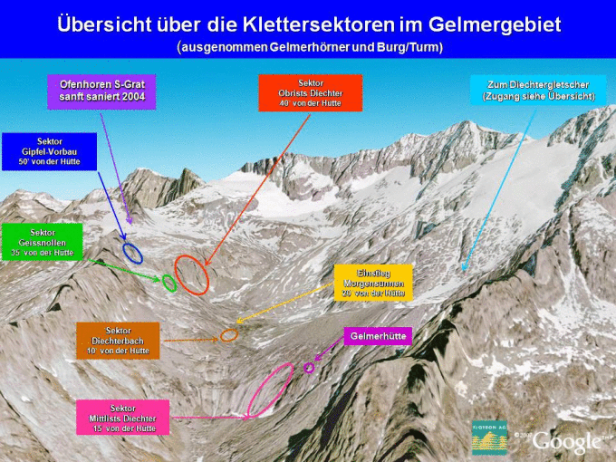 Rund um die Gelmerhütte befinden sich verschiedene Sektoren mit schönen Kletterrouten, welche zum Teil noch nicht im Alpinführer Urner Alpen 2 aufgeführt sind. Nachfolgend sind die einzelen Sektoren sowie auch der geänderte Einstieg zum Diechtergletscher aufgeführt.